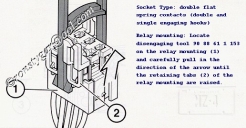Bude třeba povolit čtyři šrouby a odklopit horní díl pojistkové skříně, odjistit a vysunout směrem dolů patici relé tlumených a dálkových světel a vyjmout z nich držáky relé, a to buď šroubovákem a nebo pomocí speciálního nástroje. Dále bude třeba odjistit a vysounout směrem dolů blok s pojistkami 21 až 30.