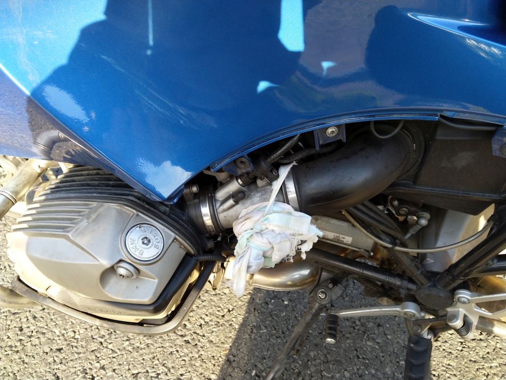 Měním motorový olej a filtr, mám čerstvě přezuto na 90/10 on/off road pneu Bridgestone A41. Už několik dnů se mi nezdá rovnoměrnost volnoběhu po důkladném zahřátí, vypadá to na potíže s levou škrtící klapkou, a tak narychlo kupuji jinou, včetně TPS a servomotorku volnoběhu. Vždy po seřízení dorazu levé škrtící klapky to jede lépe, ale jen do prvního dalšího prohřátí. Zároveň s tím, pro jistotu, měním ze zásob vstřikovací ventily za takřka nové, testované s redukcemi na R1150 RS a po tisícovce kilometrů uložené do šuplíku na horší časy.
