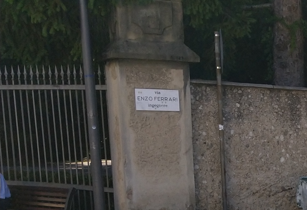 Tak se i stalo, cestou k jihu poslouchám chvilku v Modeně, v městském parku řev testovaných aut na okruhu a alespoň si fotím ulici s názvem "via Enzo Ferrari, enginner".