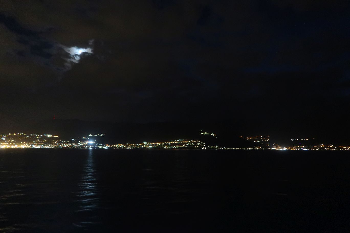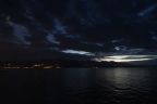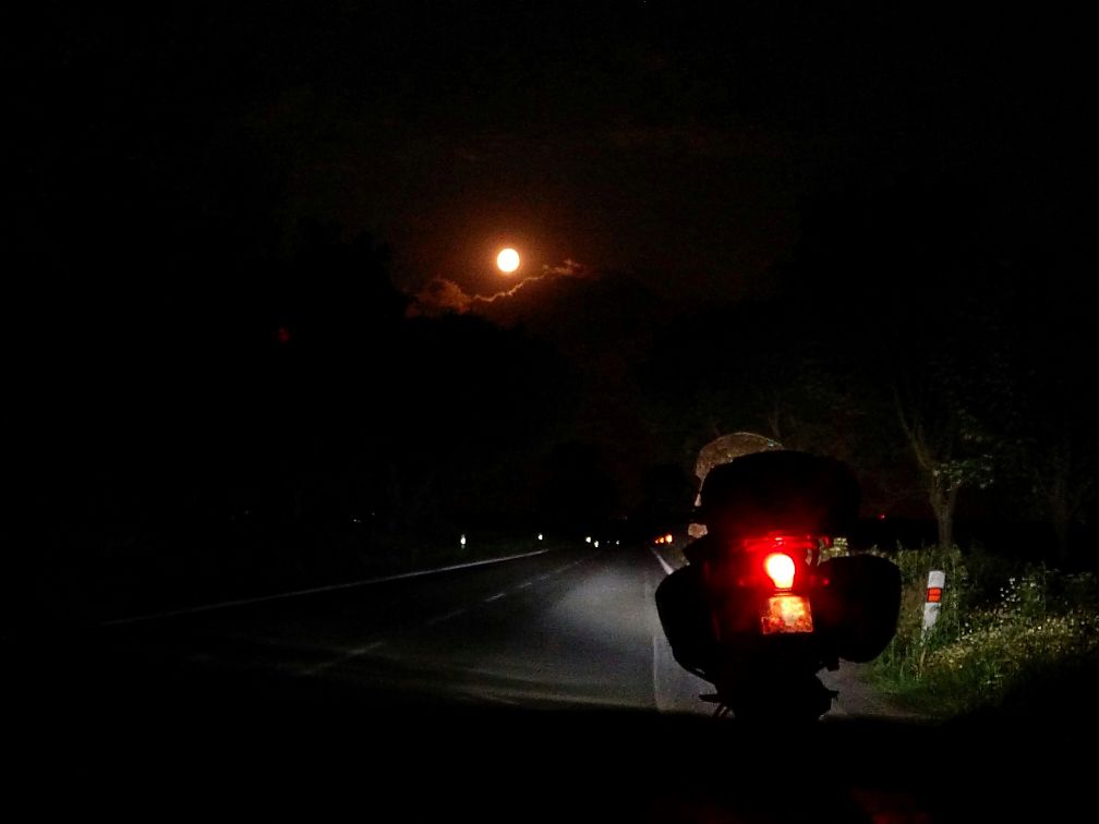 Za tmy fotím poslední momentku z cesty s měsícem těsně před úplňkem, po jedenácté hodině odemykám garáž a ukládám motorku k odpočinku.
