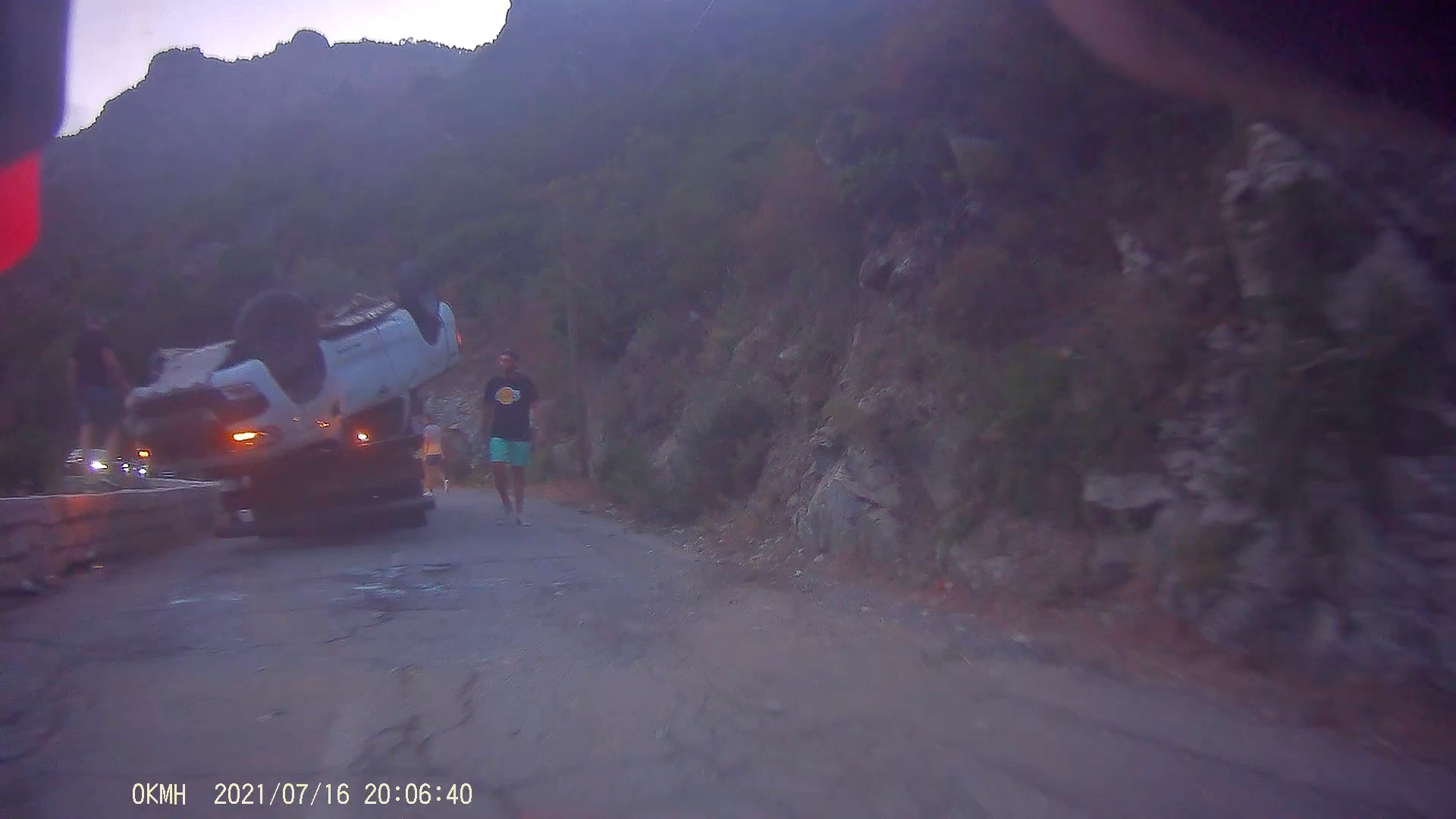 Vpředu leží motorka, postávají motorkáři v kombinézách. Po odjezdu sanitky ještě s dalším kolegou s vypnutým motorem, jako na dětském odrážedle,