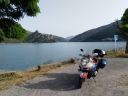 Cestou dolů z Maloya passu obdivujeme ve stráni před sebou přehradní hráz Lägh da I'Albigna (Albignasee) a ač bych rád foto motorky s touto stavbou, veřejná silnice tam nevede, v mapě je zakreslena jen lanovka.