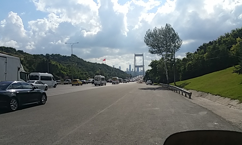 Dálničním mostem Yavuz Sultan Selim Köprüsü do Asie, druhým mostem Fatih Sultan Mehmet Köprüsü zpět do Evropy. Byl jsem v Asii :-) a po ose.