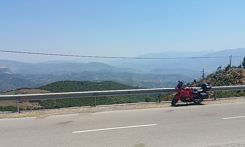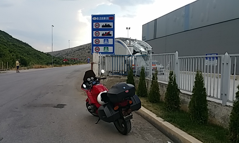 končí asfalt a pokračuje asi ½ kilometr udusané drobné a dobře sjízdné šotoliny. Odbavení na albánské straně OK, než odejdu tak dorazí maďarští motorkáři.
