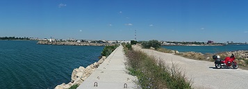 řidiči se musejí vyhýbat odbočením na soukromý dvorek, ti jedoucí po směru hodinových ručiček mají kola na hraně přístavní hráze, bez svodidel,