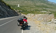 Obrazec ve tvaru kříže je vápnem malovaný na kamenech, po perfektní silnici SH20 stoupám s černohorskou hranicí po levé ruce.