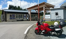 Asfalt je tam rok od roku horší, ale i tak lepší než průměrná česká okreska. Za vrcholovým tunelem památeční foto a debata s dvěma týpky na endurech odkudsi z Kladenska.