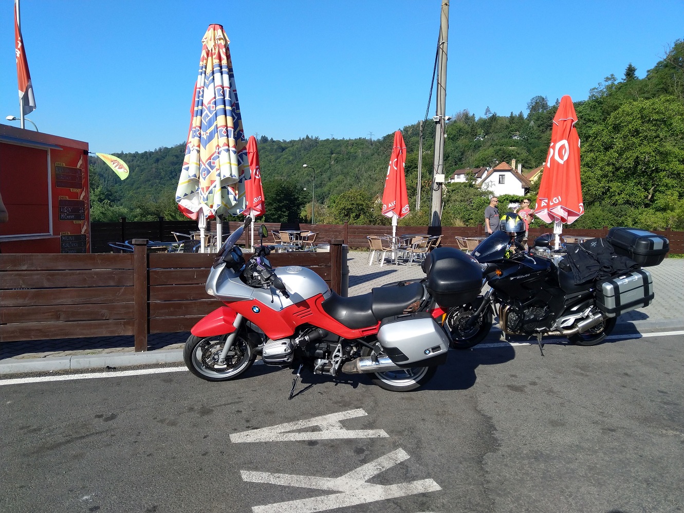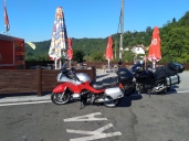 Po třičtvrtěhodině, v předstihu, dostáváme jídlo. Na parkovišti potkáme partu Slováků na různých verzích V-Stromů, společně posloucháme jakési enduro šplhající z druhé strany parku.