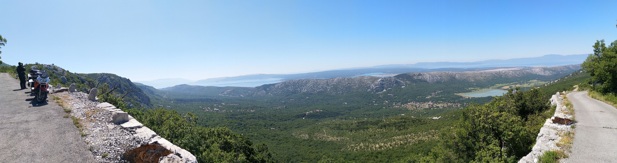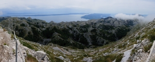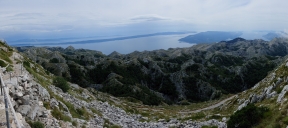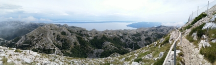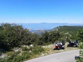 Hladoví jedeme s Márou natankovat, poté stoupáme do svahu nad pobřežím na první "kozí stezku" nad městy Jadranovo a Crkvenica, kocháme se panoramaty z výšek necelých 800 metrů nad mořem,