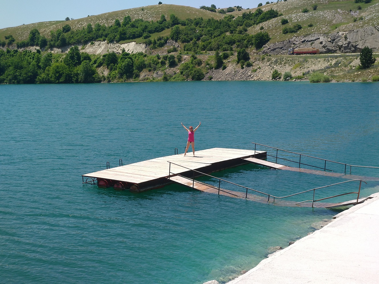 Další zastávkou, krom doplnění paliva a tekutin pro nás, je jezero Klinje. Přes nadmořskou výšku přes 1000 metrů je voda příjemně teplá, čistá, u skalnatého břehu se na mělčinách vyhřívají hejna ryb.