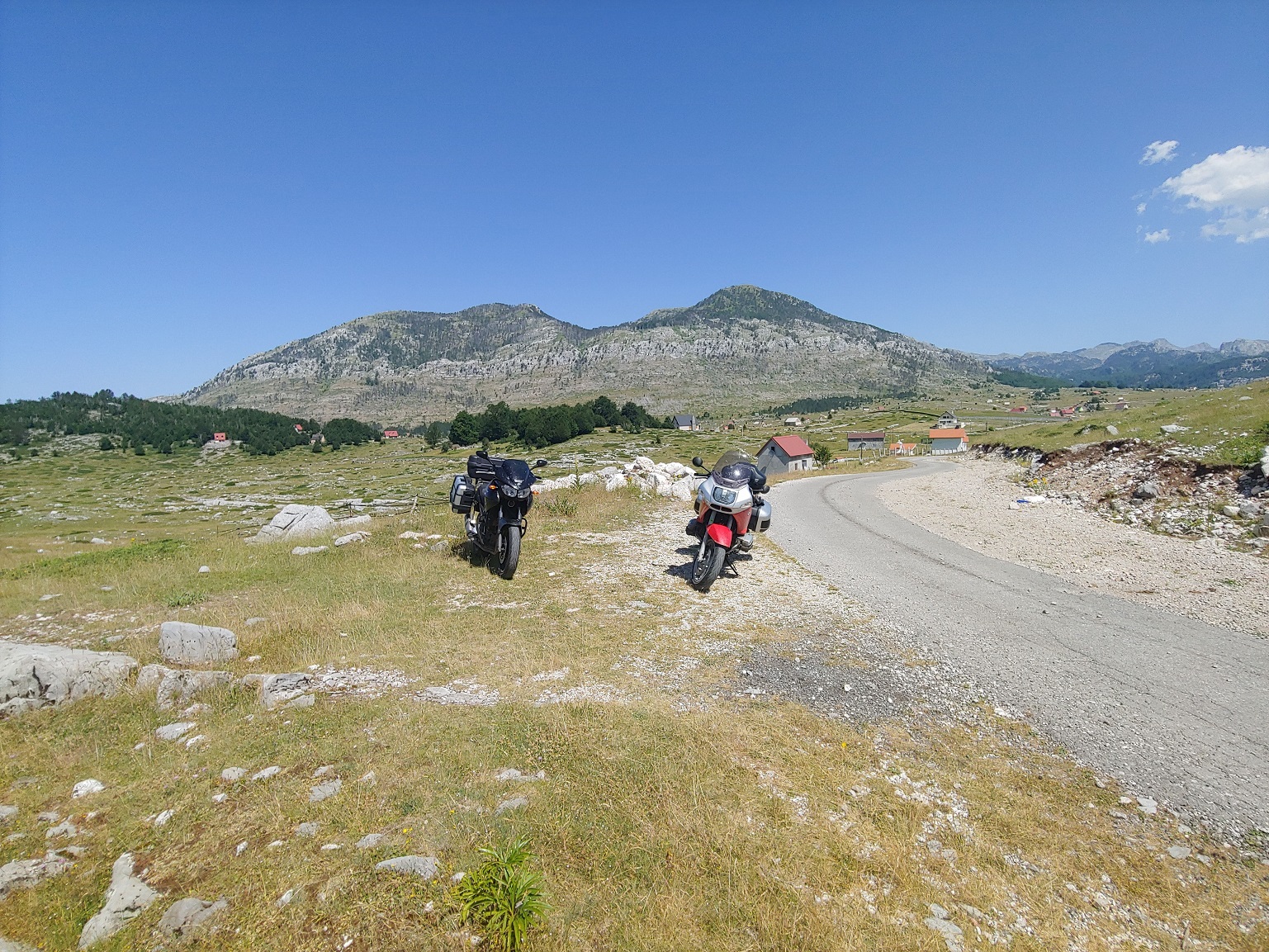 Na obloze narůstají podezřele tmavé mraky, jsou vidět blesky a slyšet hromy, jen mírně navlhlí začínajícím deštěm stihneme dojet do restaurace Izvor na planině jižně od Žabljaku.