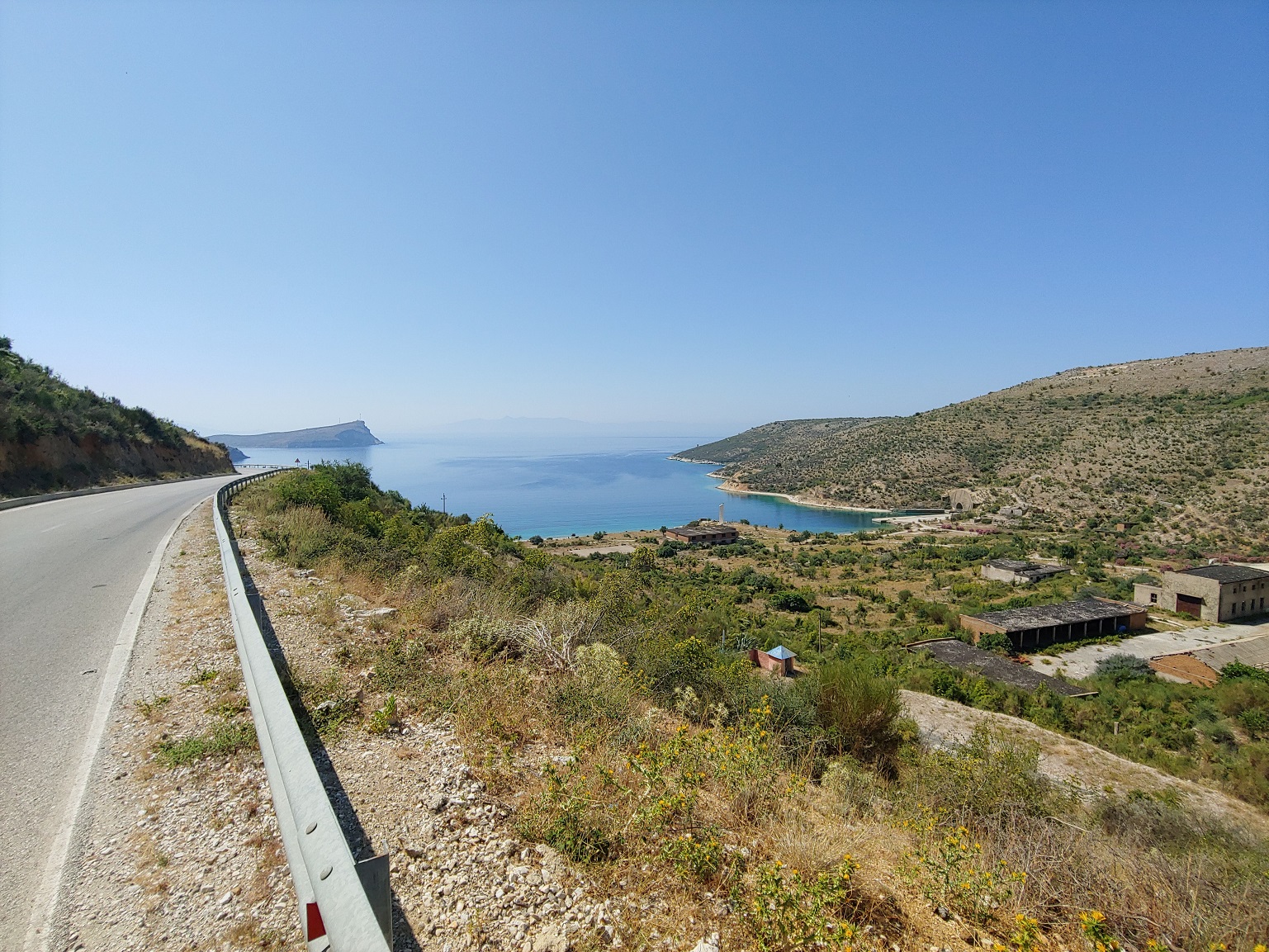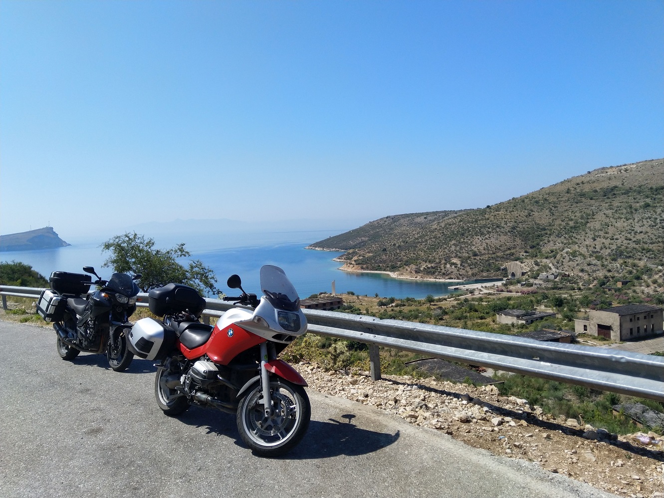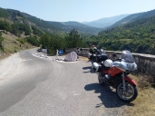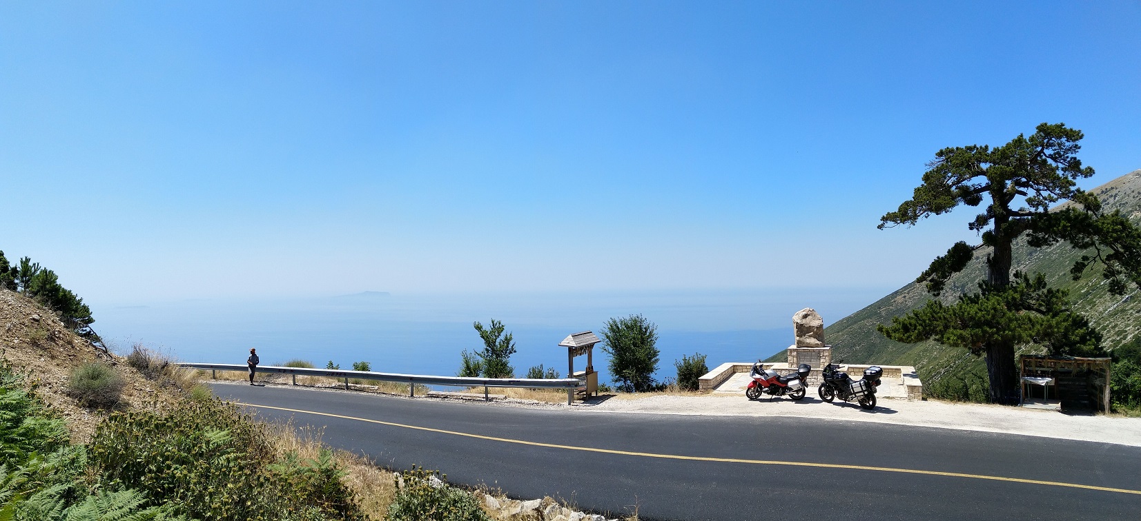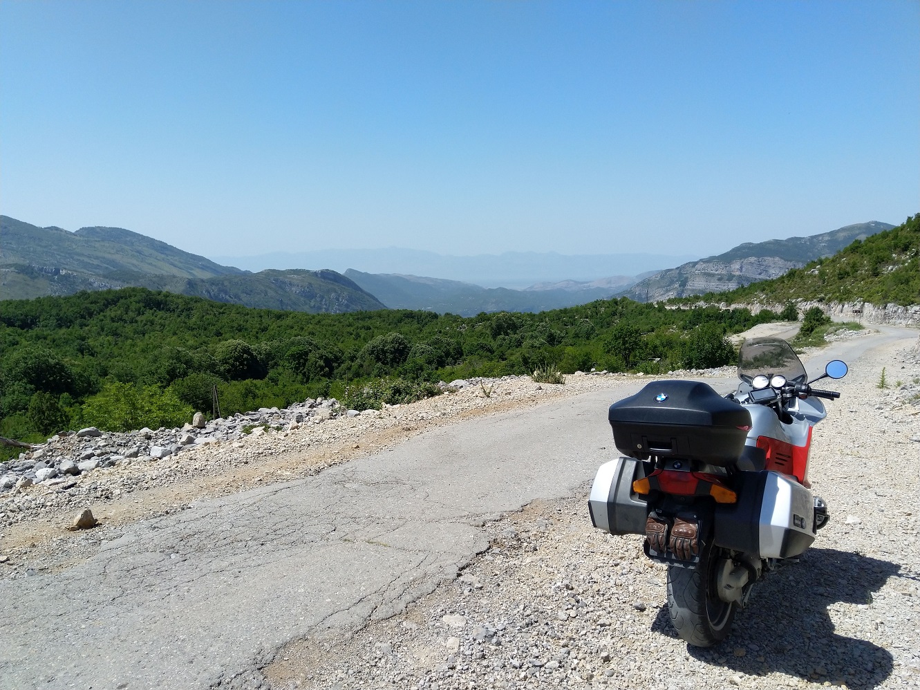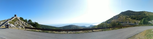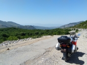 Posedíme ve vyhlídkové restauraci a doplníme tekutiny. Příjemným překvapením je nový asfalt na sjezdu k Vlore, od vrcholu až pod národní park.