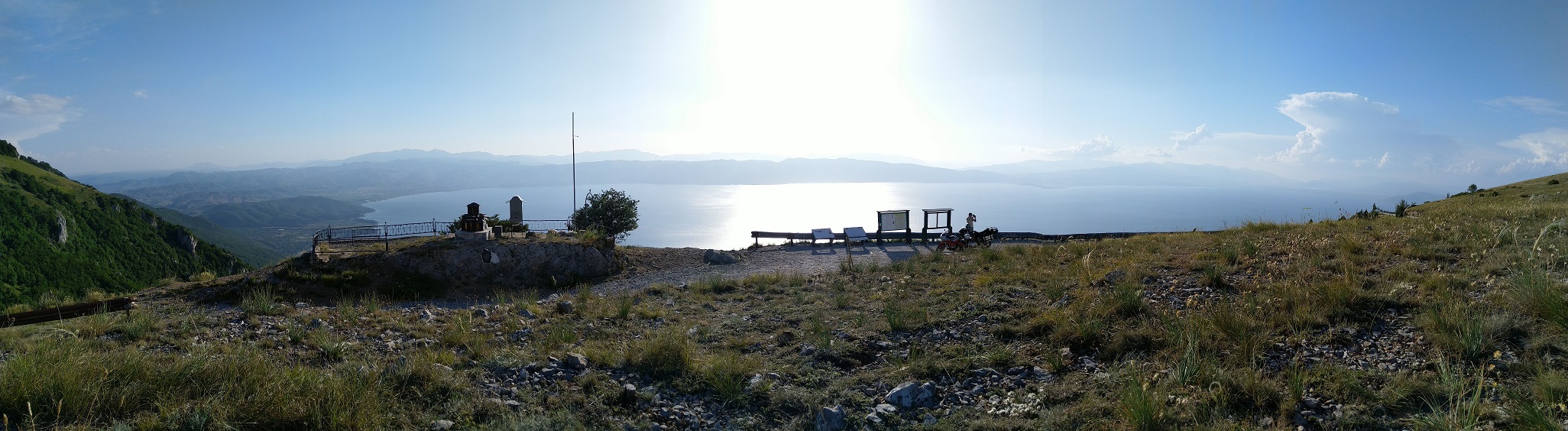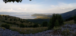 Počasí nám přeje, podél Debarského jezera dojedeme k Ohridskému, jižně od města Ohrid po odpočce vlevo platíme vjezd do parku Galičica a nahoře se kocháme výhledy na jezero Ohrid.