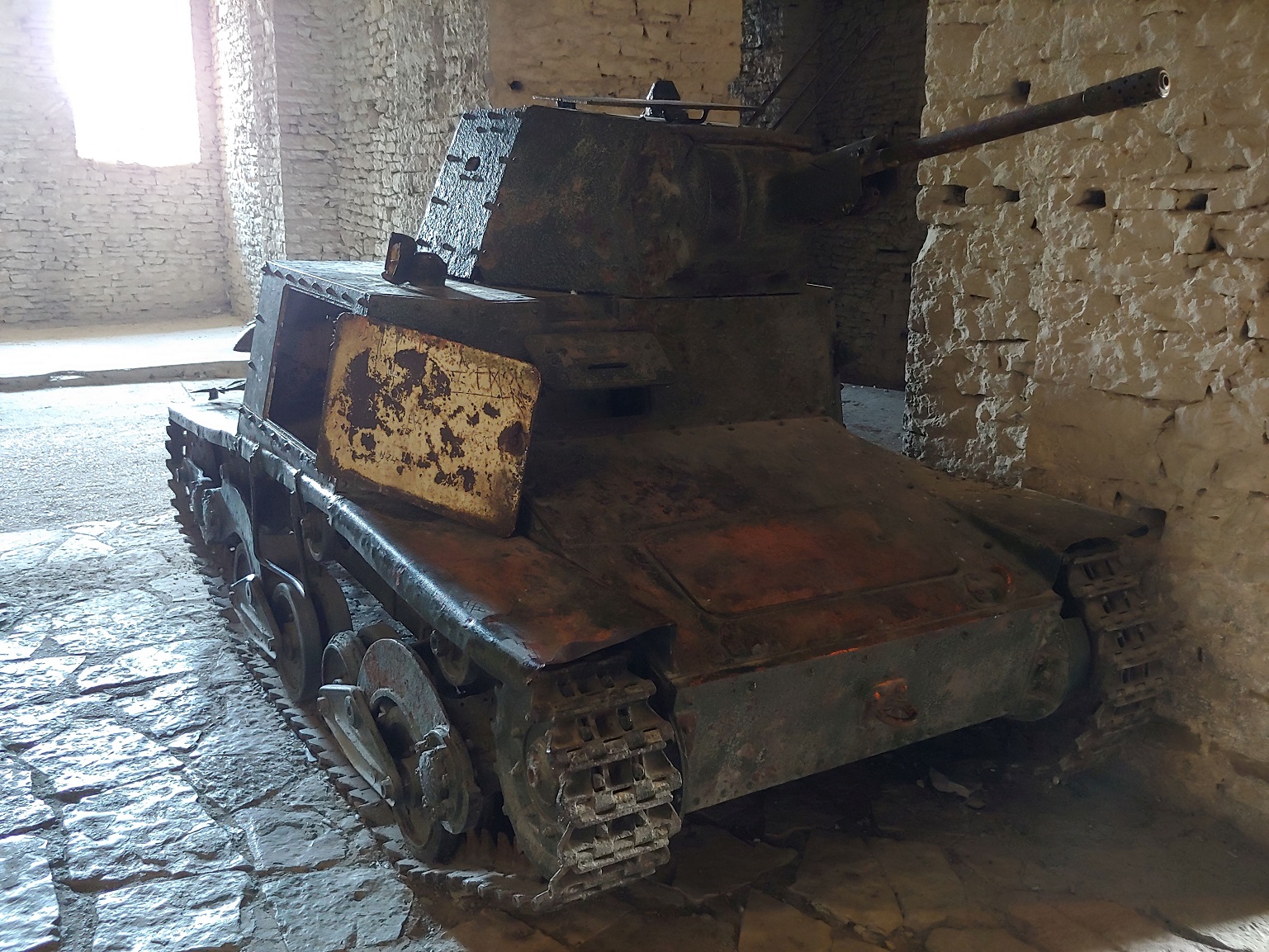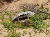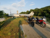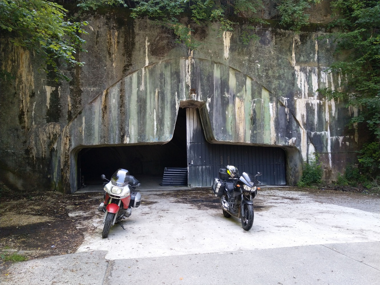 minou nás bez povšimnutí a celou základnu si v klidu projedeme a nafotíme. Jeden z tunelů má vytržená vrata, avšak ruční světlo nemáme a odvaha vjet dovnitř na kluzký vlhký beton na motorkách nám též chybí.