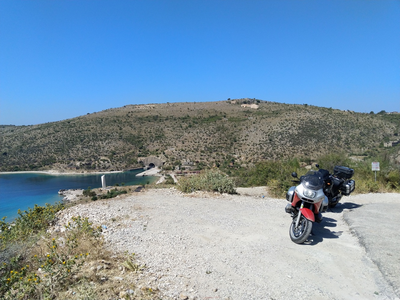 V pobřežních městech za Sarandou je hustý nedělní provoz, místy jedeme krokem. Za středověkou pevností Porto Palermo fotíme tunel ponorkové základy, zkoušíme sjet dolů,