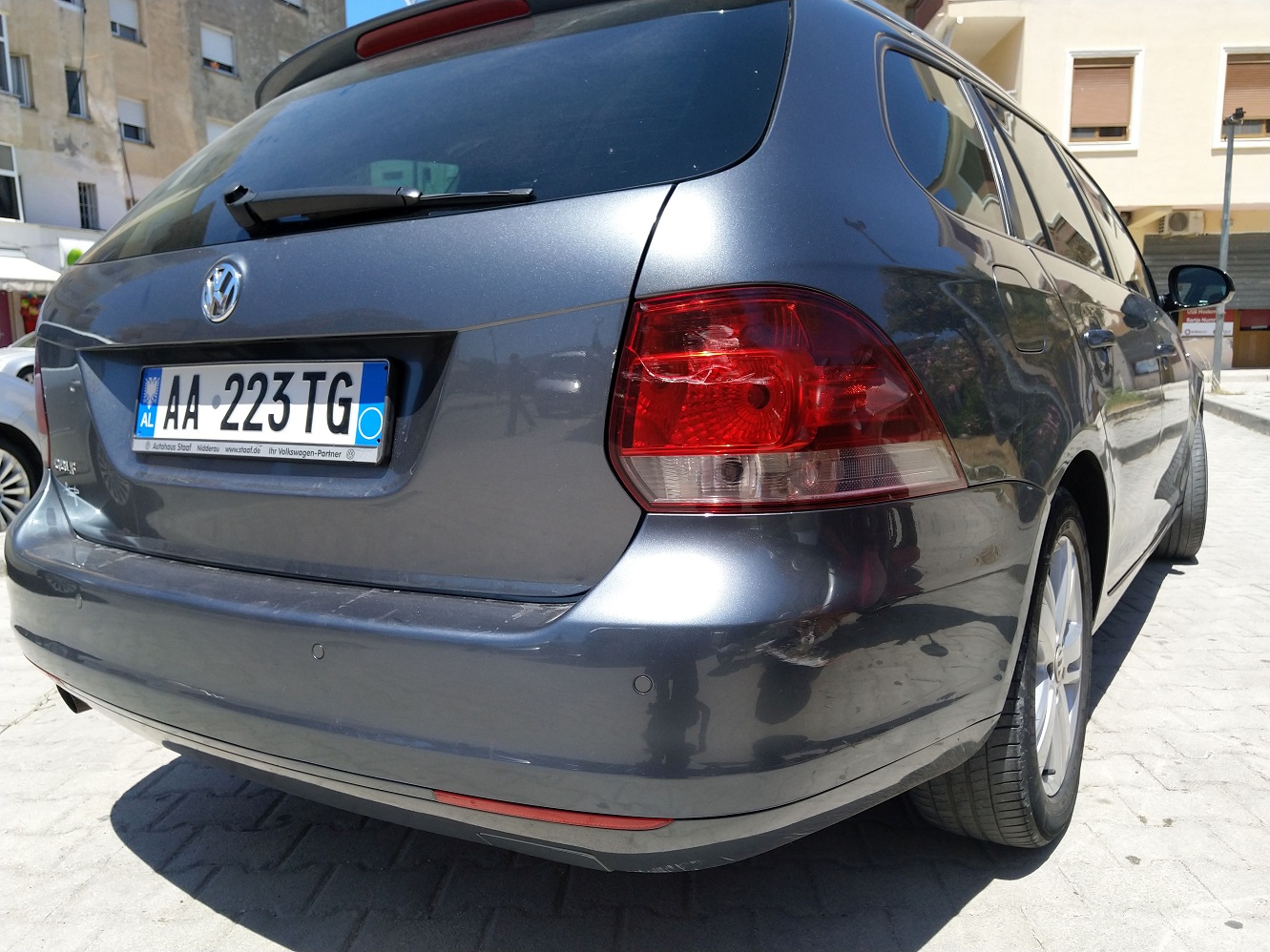Před mostem ve městě Orikum je zádrhel v dopravě, autobus dávající prostor protijedoucímu nákladnímu vozu začne couvat a před námi jedoucí řidič ve VW Golf Variant panikaří, náhle a nečekaně brzdí.