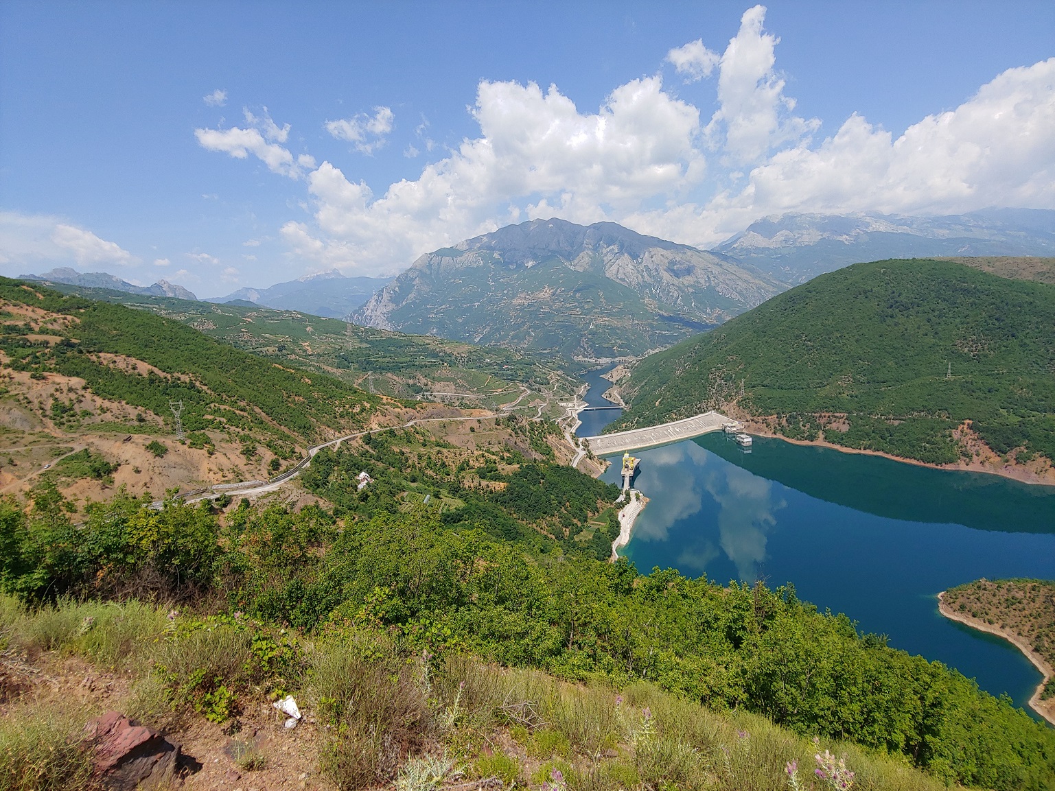 SH22, po odbočení z SH5 za Qafë-Mal, je zatáčkovitější a pomalejší než jsem čekal, dvouhodinová rezerva do odjezdu trajektu se smrskla na hodinu, i tak máme čas na fotky elektrárny Fierzë.