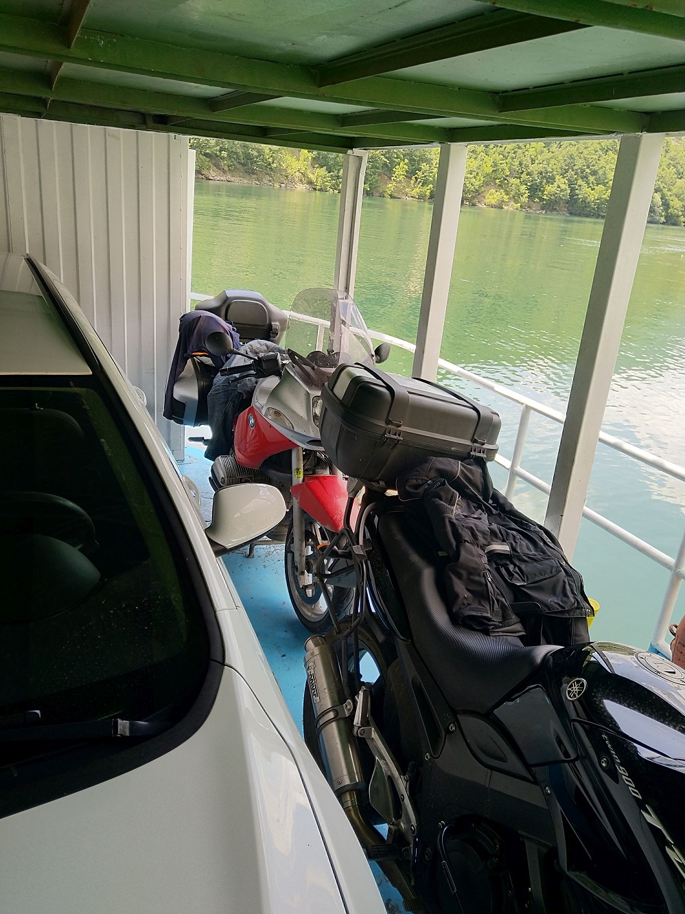 Před naloděním z nás vymámí 100 lekk za každou motorku poplatek "pass porto", na trajekt najíždíme první a umísťují nás na záď, pod kabinu s cestujícími.