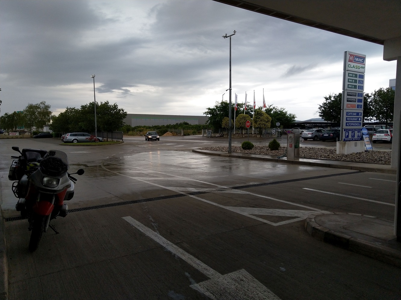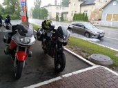 měli bychom stihnout dojet do Strakonic na první čerpačku a nezmoknout, což se daří jen částečně - odbočujeme na Benzinu za silného deště ale nepromočení.