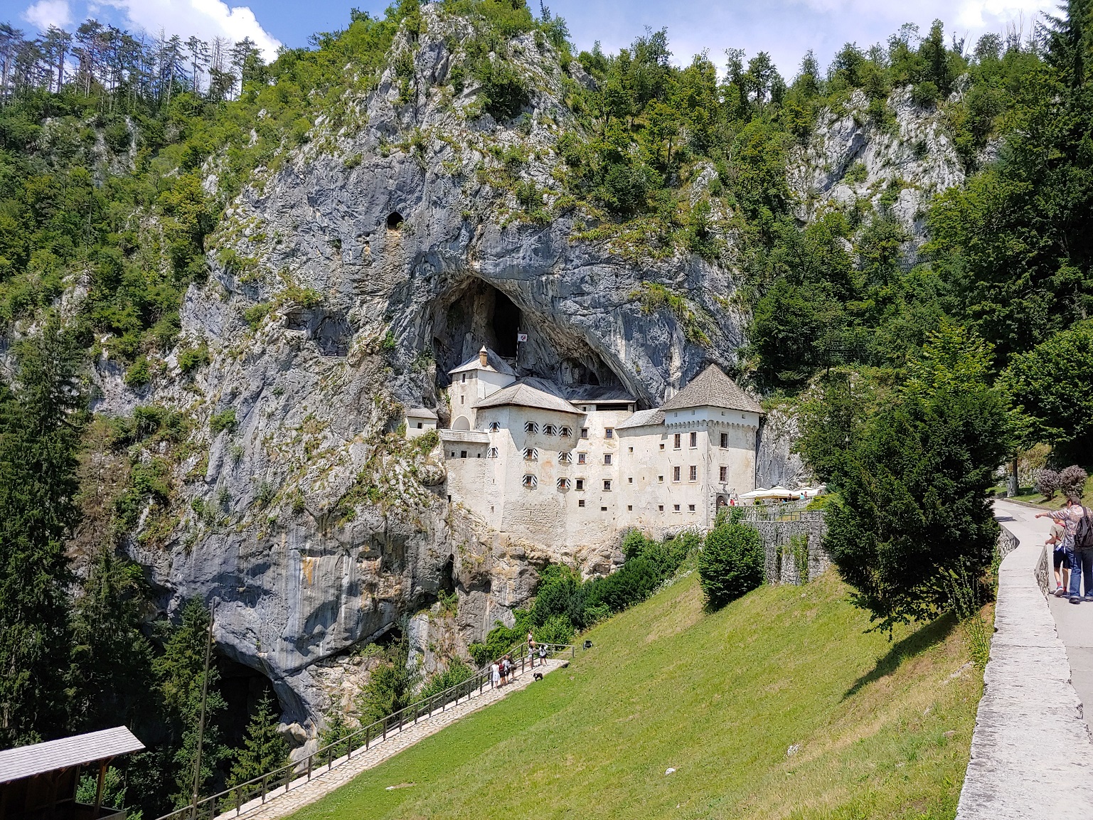 Počasí ráno vypadá slibně a tak první zastávka, vlastně druhá neboť první byla tankovací, je u Predjamského hradu.