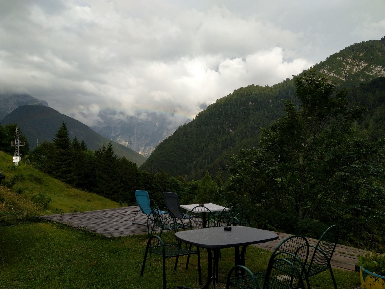 Kouknem do Itálie, do Rakouska, na oblohu a raději zrychlíme sestup. První kapky chytáme v bývalé celnici SLO-IT v restauraci,