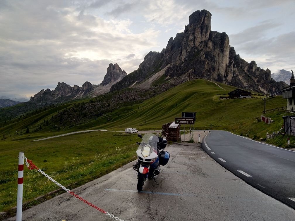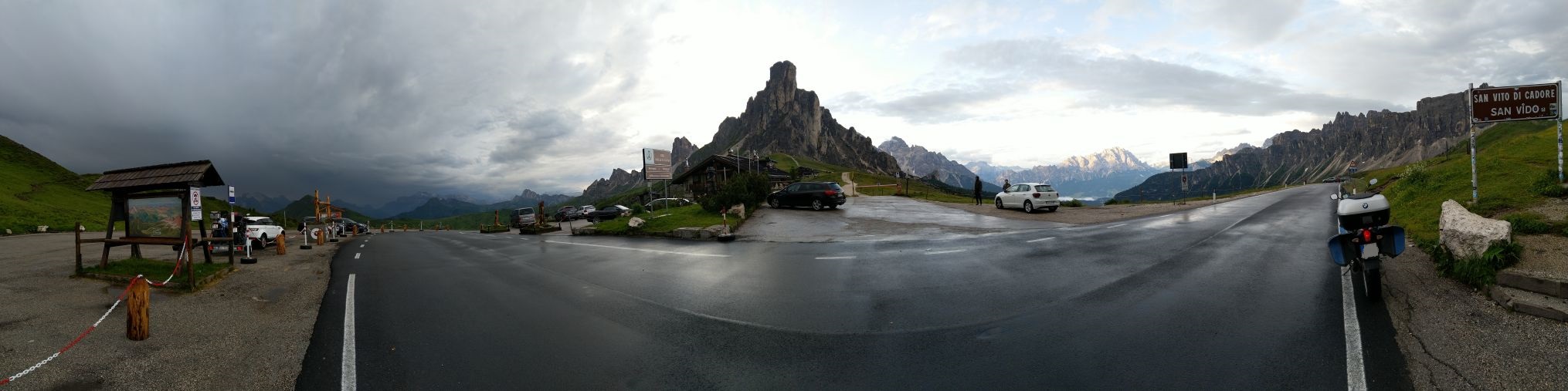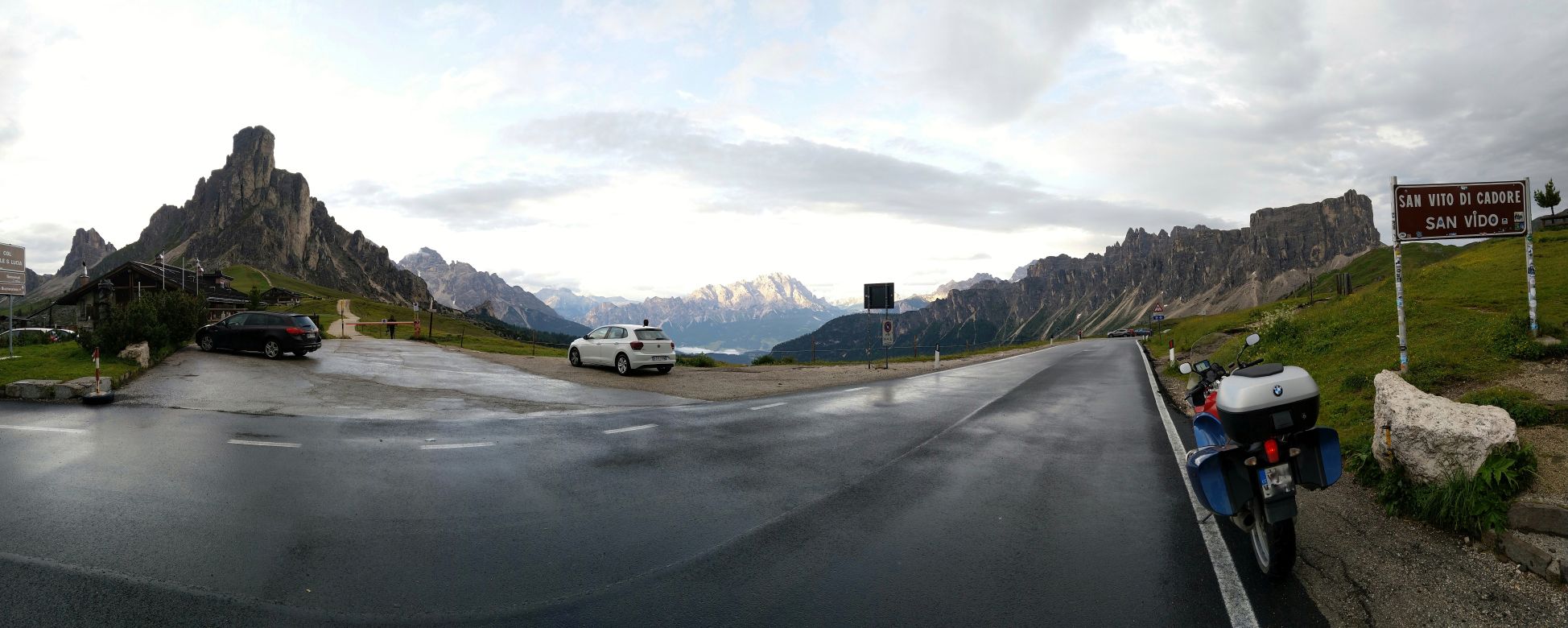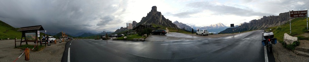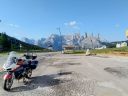 Počasí se lepší, na passo Giau je, až na chladných 8°C nádherně a před dalším Mordorem stíhám za sucha nafotit panorama Cortiny d'Ampezzo z bývalé horní stanice lanovky,