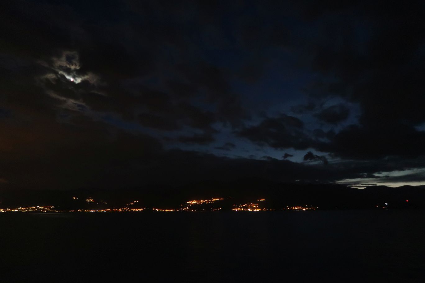 Za tmy fotím poslední momentku z cesty s měsícem těsně před úplňkem, po jedenácté hodině odemykám garáž a ukládám motorku k odpočinku.