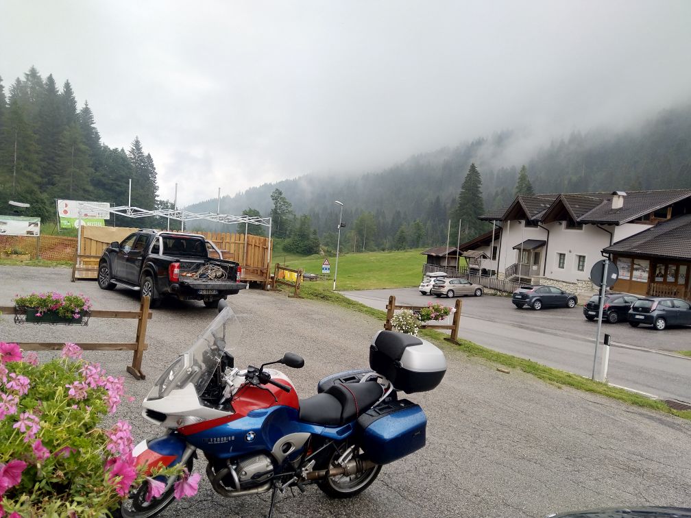 Ráno pár kapek před hotelem, na Monte Bondone bloudění v mlze při hledání motorky na pustém parkovišti, pak trochu zlepšení a teď bude dloooouhý oběd.