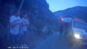 Vpředu leží motorka, postávají motorkáři v kombinézách. Po odjezdu sanitky ještě s dalším kolegou s vypnutým motorem, jako na dětském odrážedle,