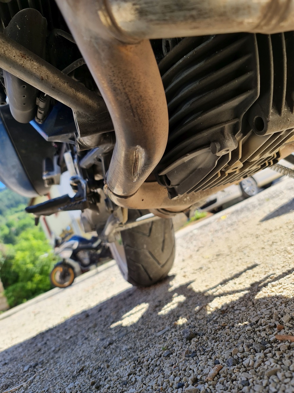 pásoviny a po najetí na ni utrpí motorka promáčklinu ve výfukovém svodu pravého válce.