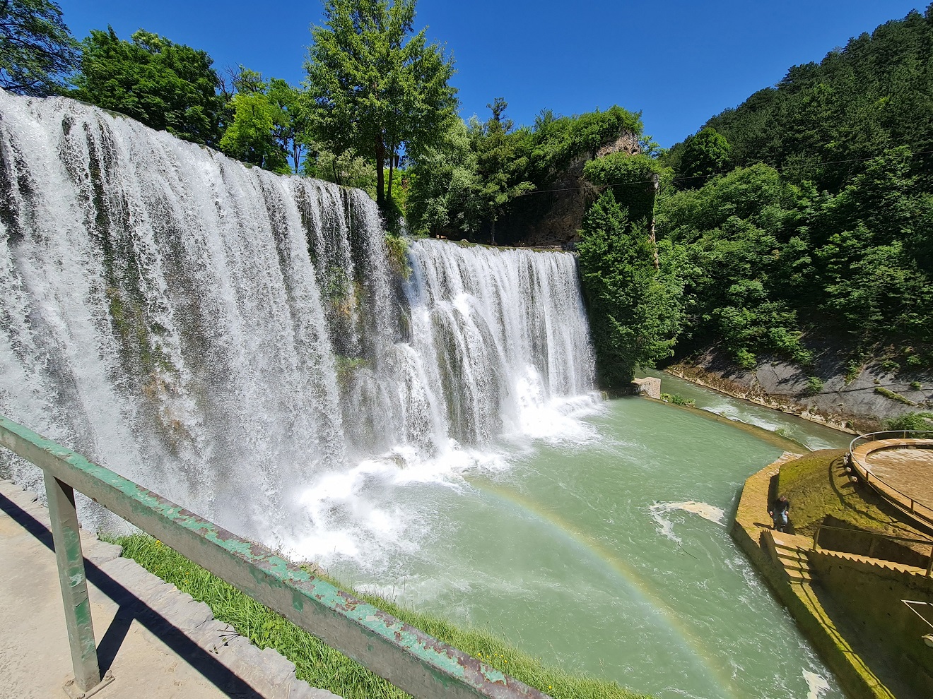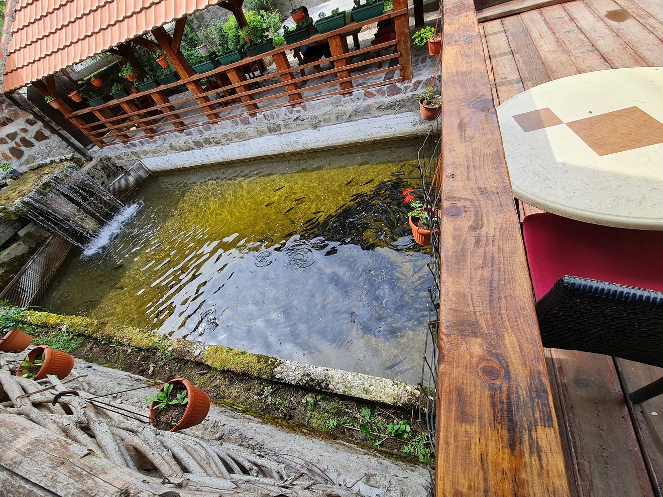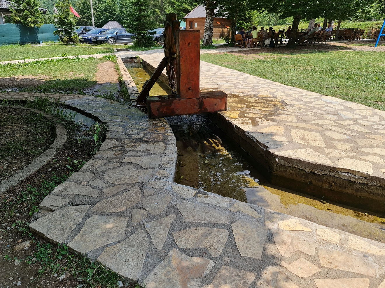 V klesání k Mateševu si dopřejeme sviežu pastrmku v Nacionalnim Restoranu Ribnjak. Ryby snad už nemohou být čerstvější, jsou v náhonu protékajícím středem areálu restaurace.
