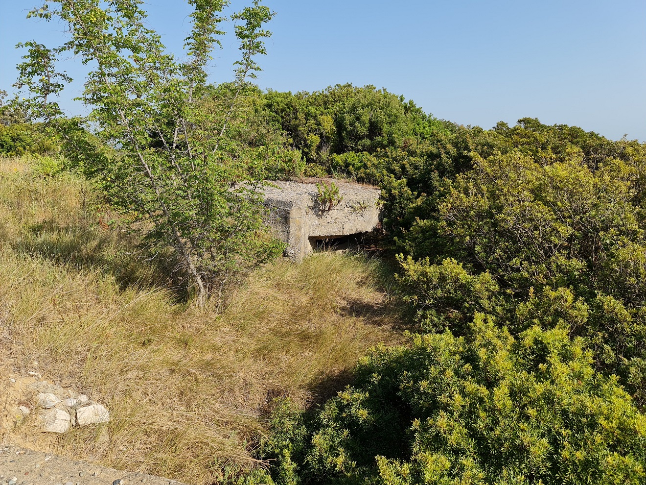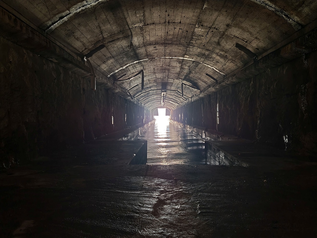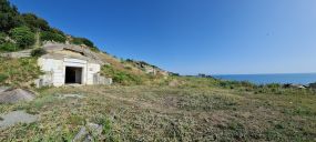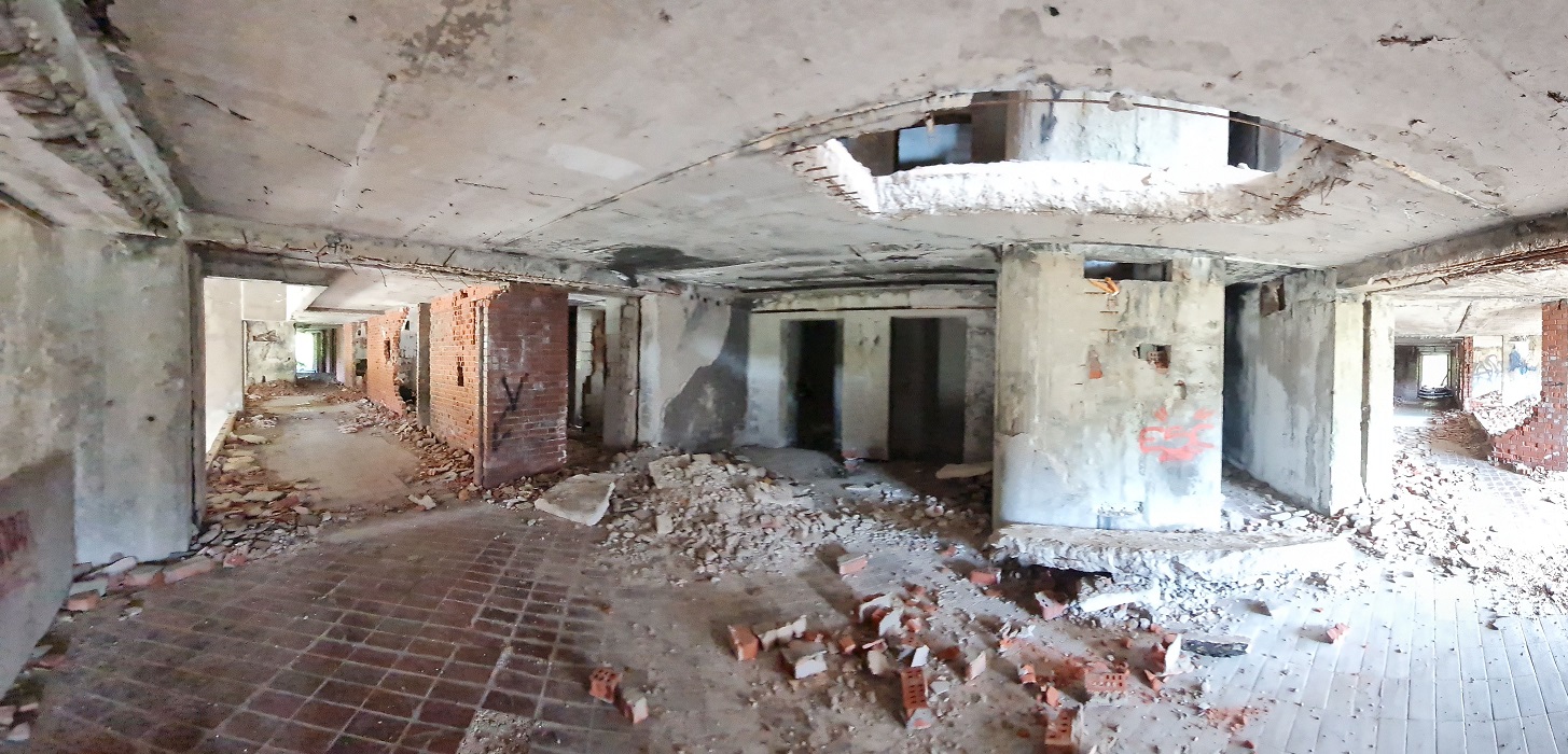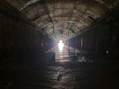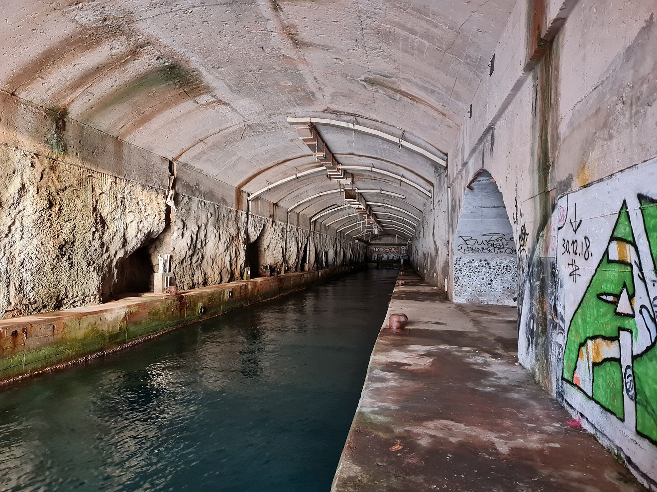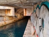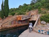 k bývalé ponorkové základně. Po průzkumu vnitřku a malé přípravě nebo spíš úpravě prostředí přejíždíme přes navezené sutiny až vybetonovanému ústí hlavního tunelu.