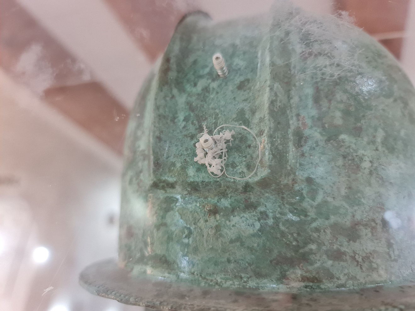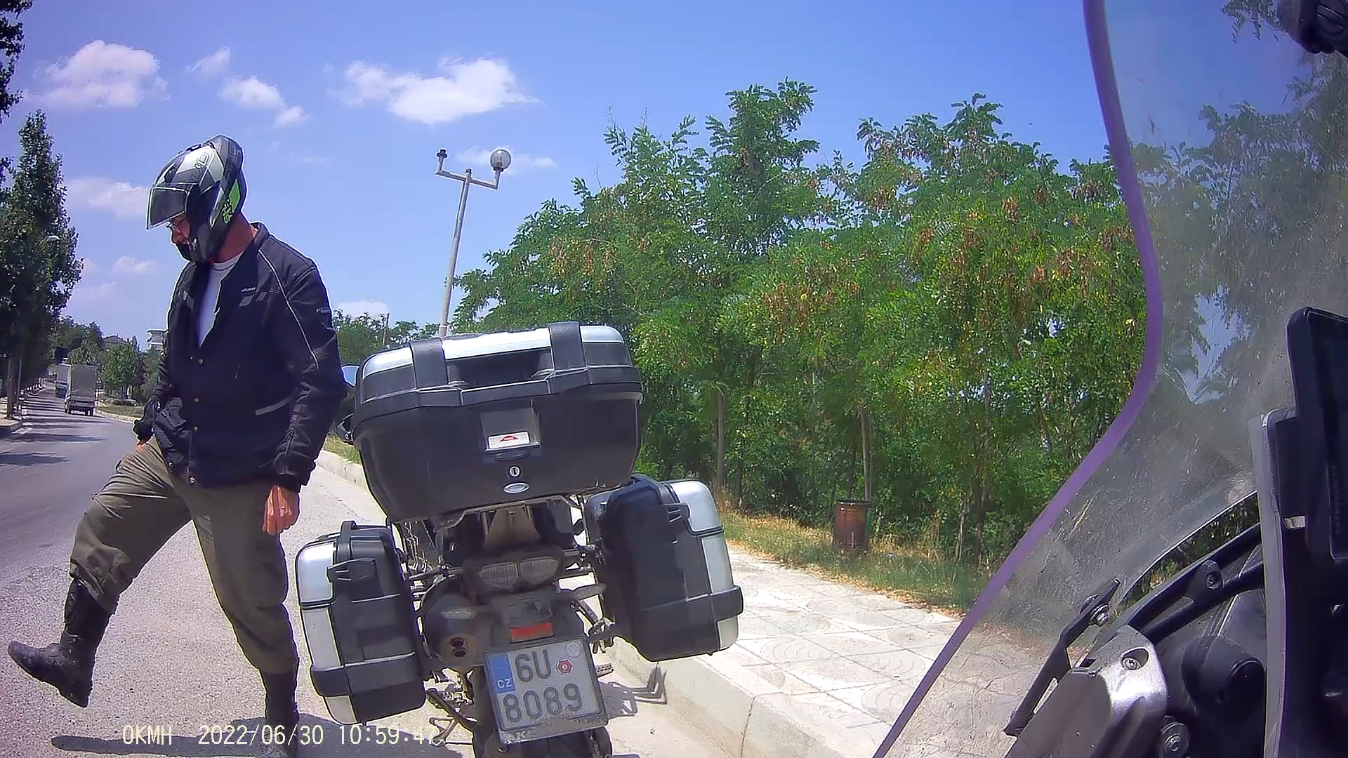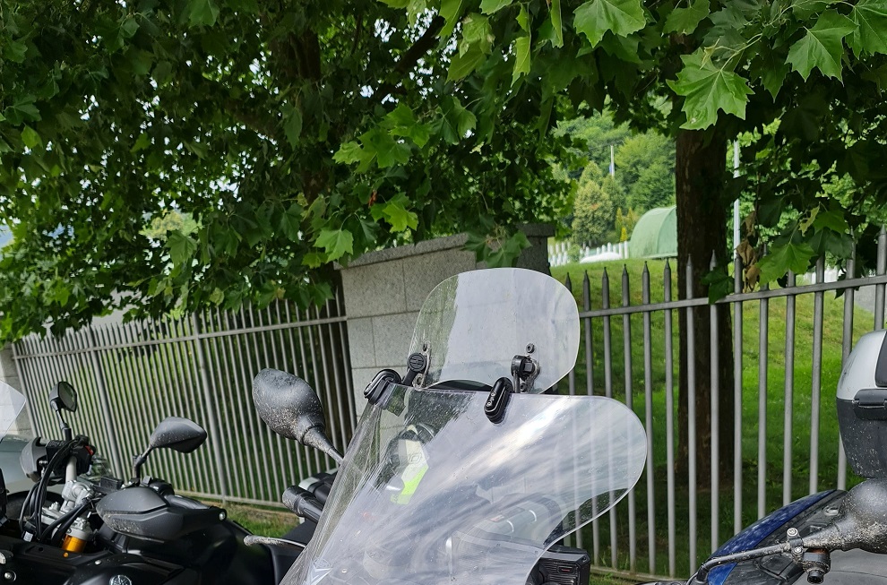 Po prohlídce využívám chvilky ve stínu na parkovišti a měním konfiguraci deflektoru plexi štítu motorky, abych mohl jezdit s vyklopenou bradou přilby.