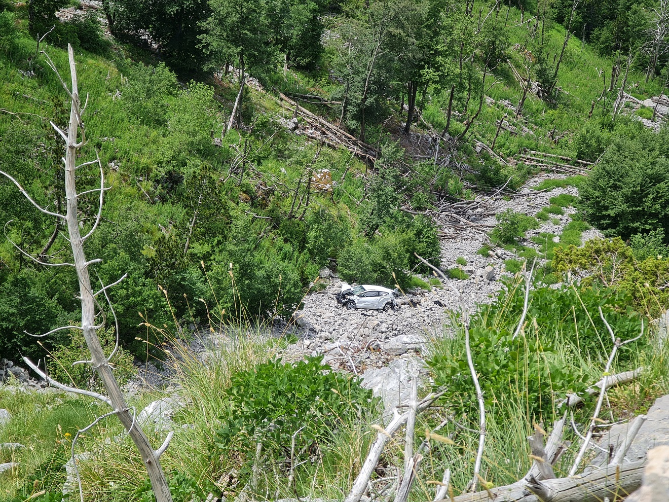 Na další zastávce spřádáme teorie, jak asi dlouho leží vrak osobního auta v rokli pod námi a zda to někdo přežil.