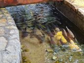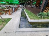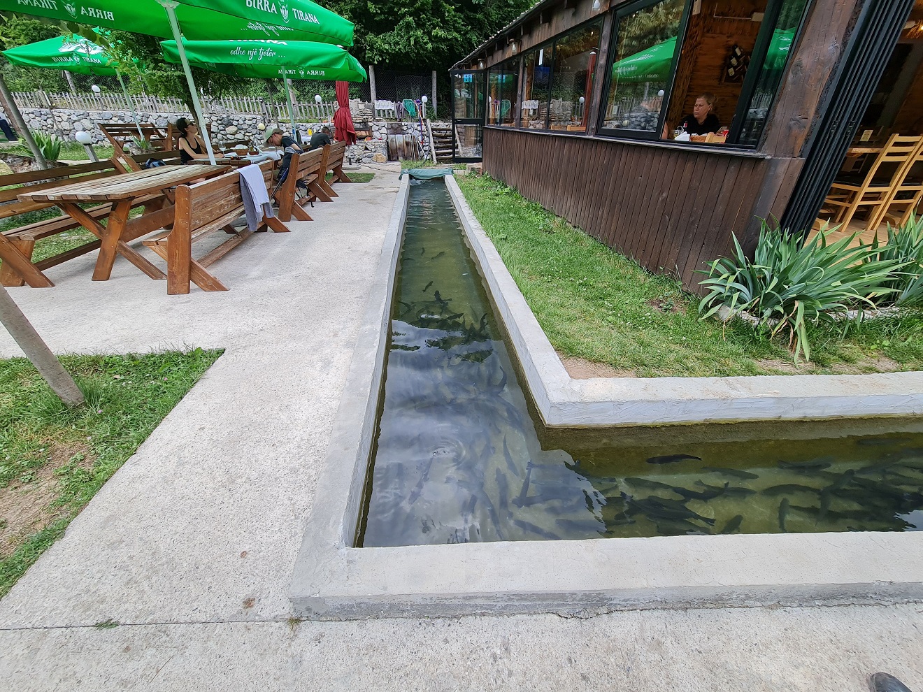 Pstruzi v náhonu protékajícím areálem hotelu vypadají lákavě, ale Valbonë nějak zešpindlovatělo.