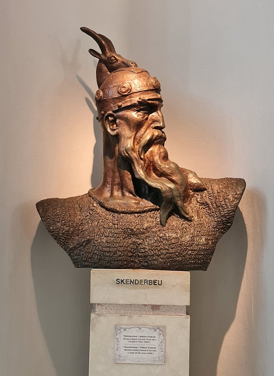 Před opuštěním Albánie ve Skodëru jdu na nákup darů z cest, v prodejně SPAR tři dvoudecové lahve místního brandy Skanderbeg.