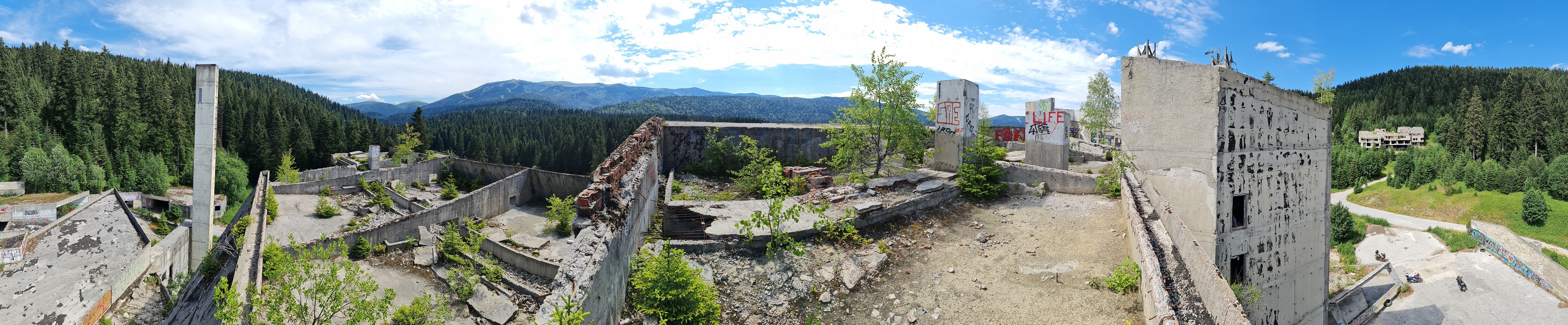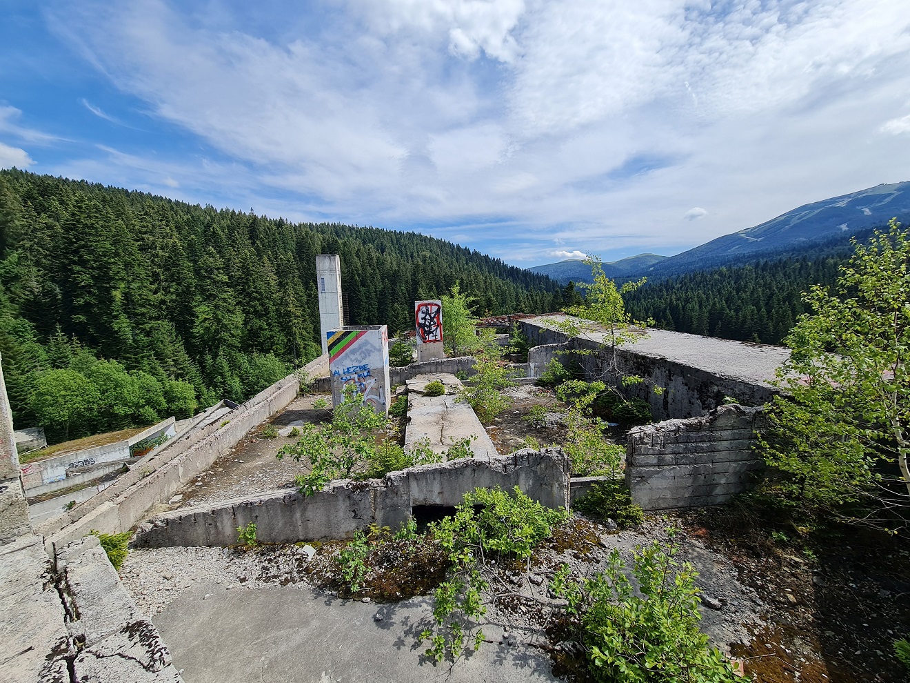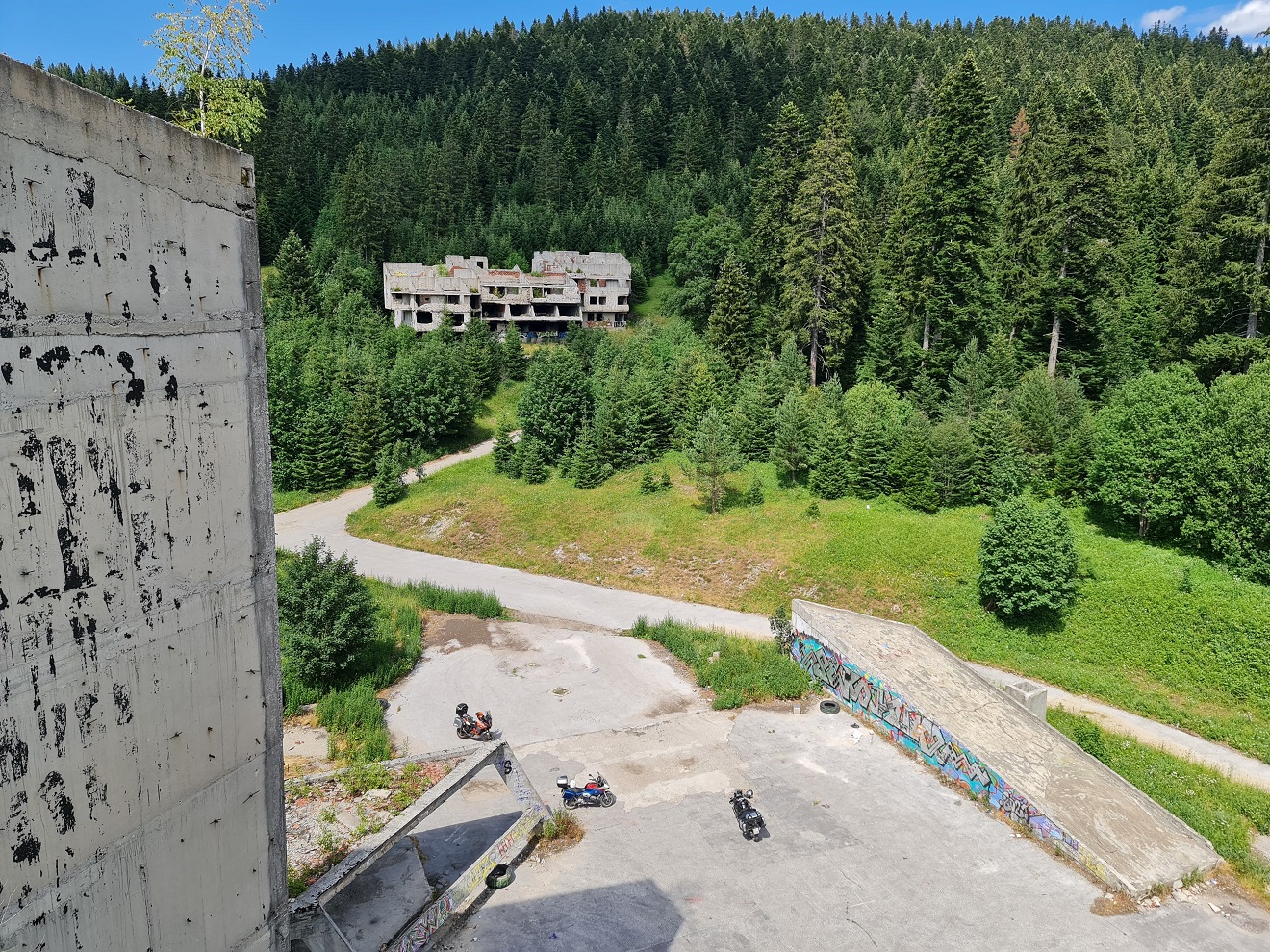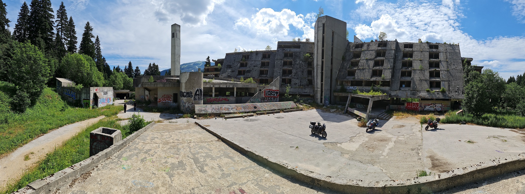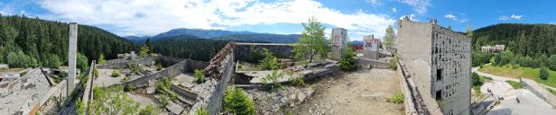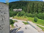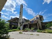 Začínáme u skokanských můstků a nevíce času strávíme urbexem hotelu Igman, po vnitřních schodištích vyjdeme až ke strojovně výtahů a ven na střechu.