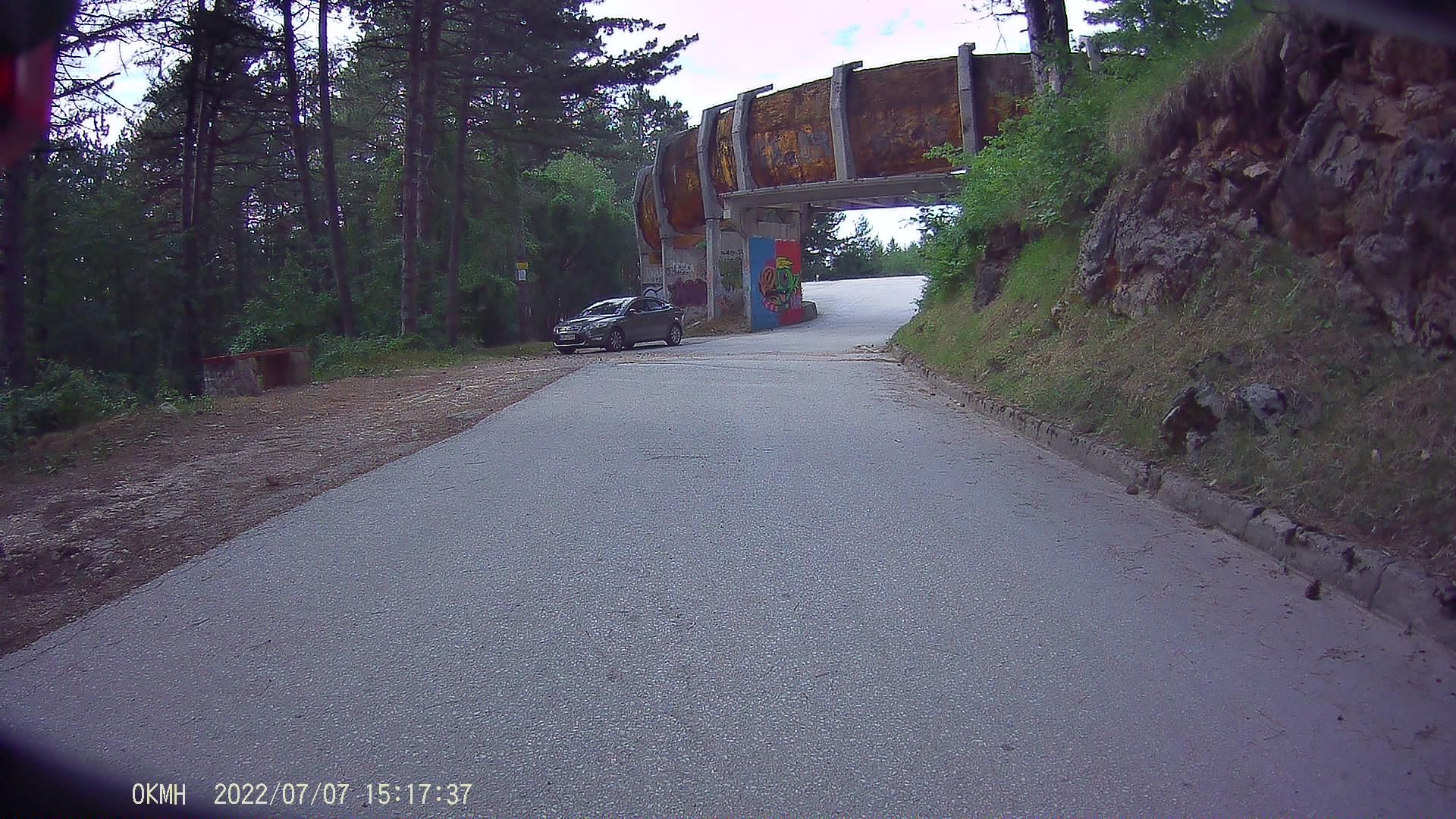 Najíždíme na východním konci u obce Mesići, po dešti přiměřeně sjízdnou cestu s pruhem trávy uprostřed střídají tunely s kluzkým povrchem,