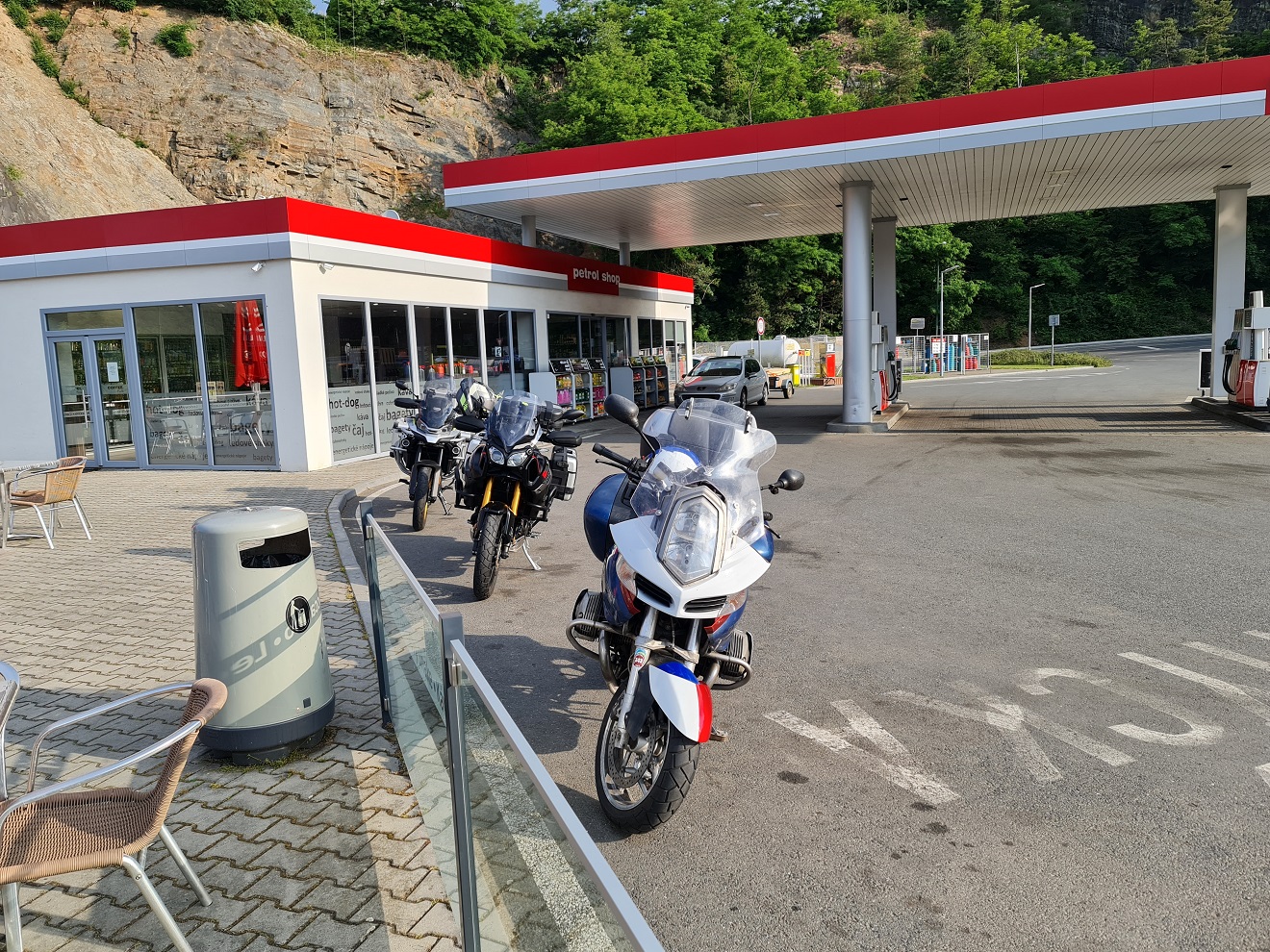 Než dotankujeme plnou za 31,15 Kč za litr, než se rozhodneme obléct nebo neobléct nepromoky a než se do nich nasoukáme, stihne mrak přejít nad námi a vyjíždíme do končícího deště.