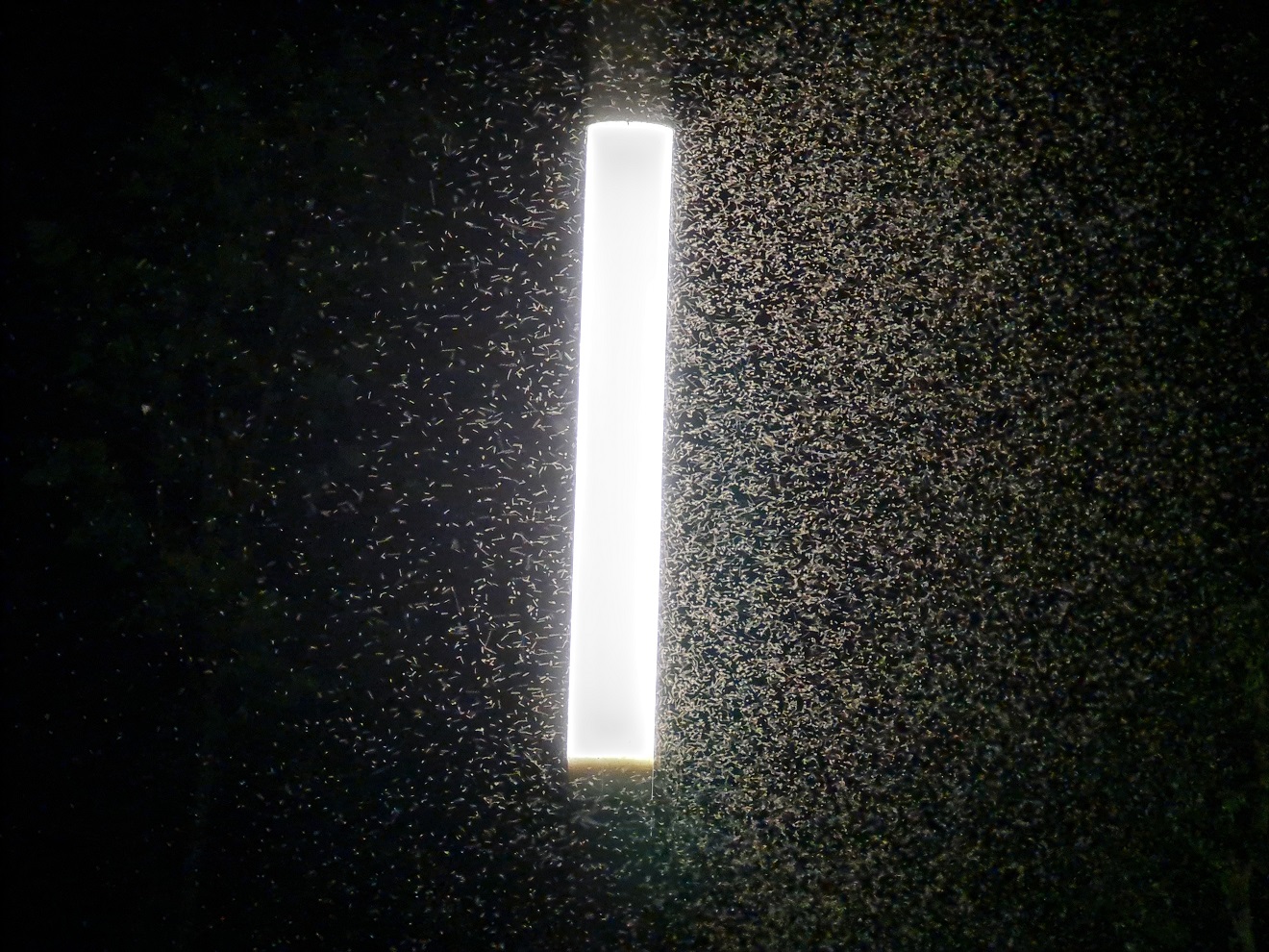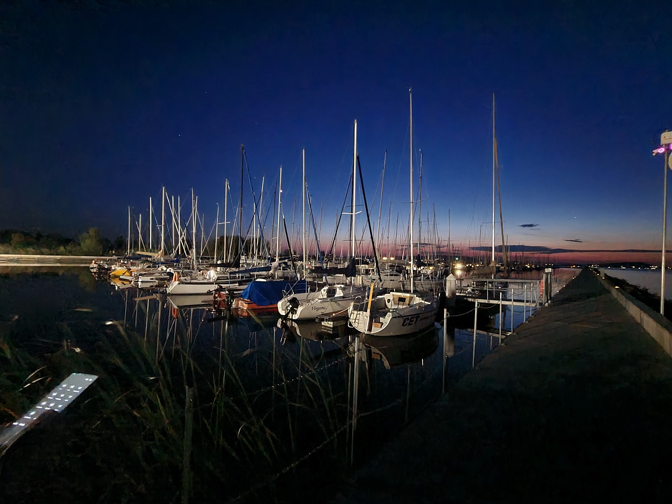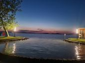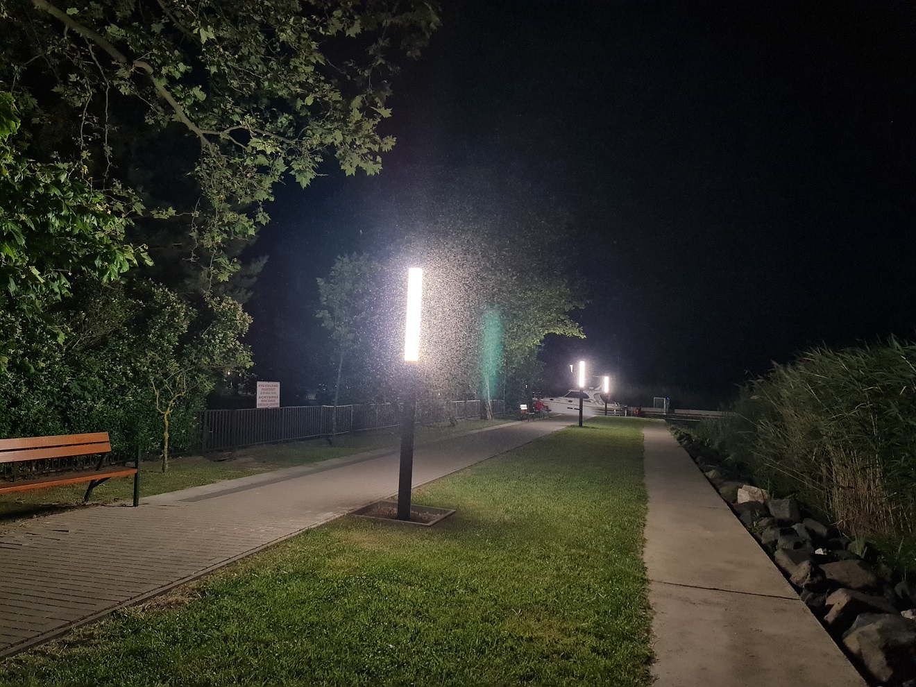Přespíme u Balatonu, s procházkou k jezeru. Svislé osvětlovací sloupy sice oslňují, ale dobře koncentrují obtížný hmyz.