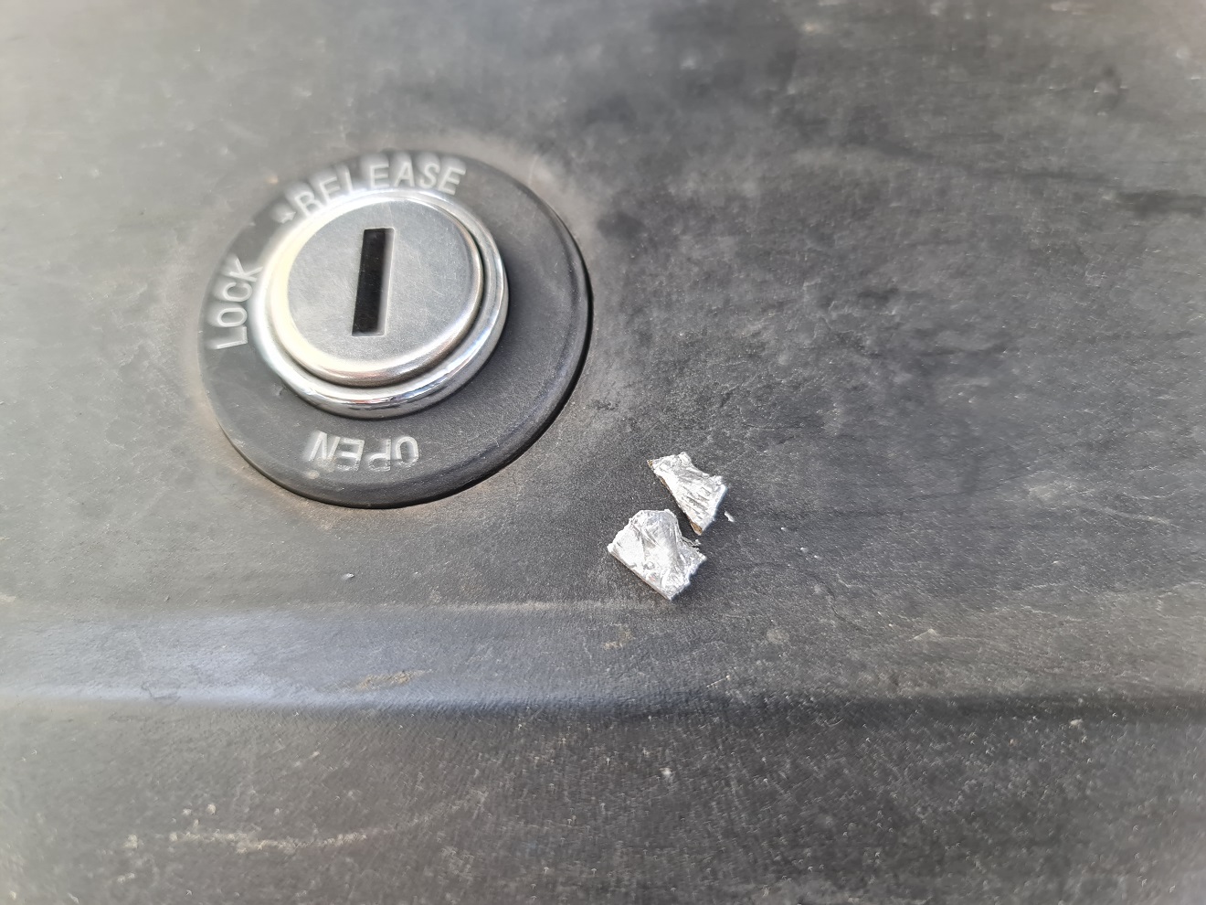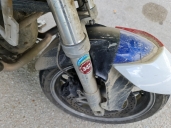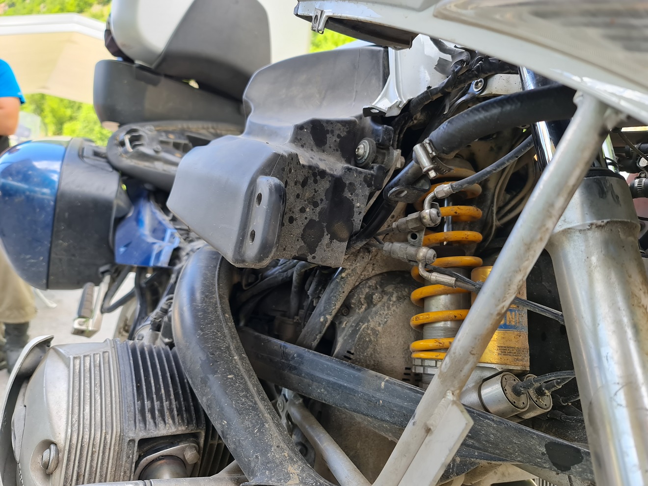 Při debatě s místním motorkářem si všimnu mastného fleku na předním blatníku, kontroluji jestli nezačal prosakovat odvzdušňovací šroub předního kluzáku, ale tam je sucho.