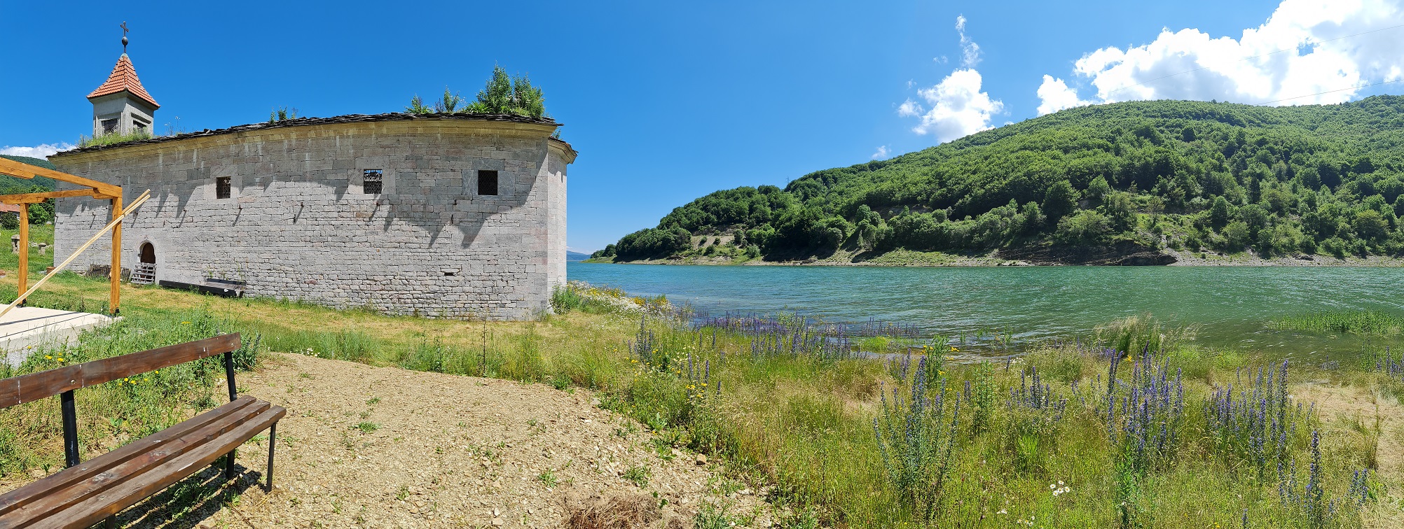 Fotíme si dříve zatopený kostel, kdysi bývala hladina výš a sahala až pod střecho kostela.