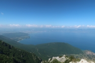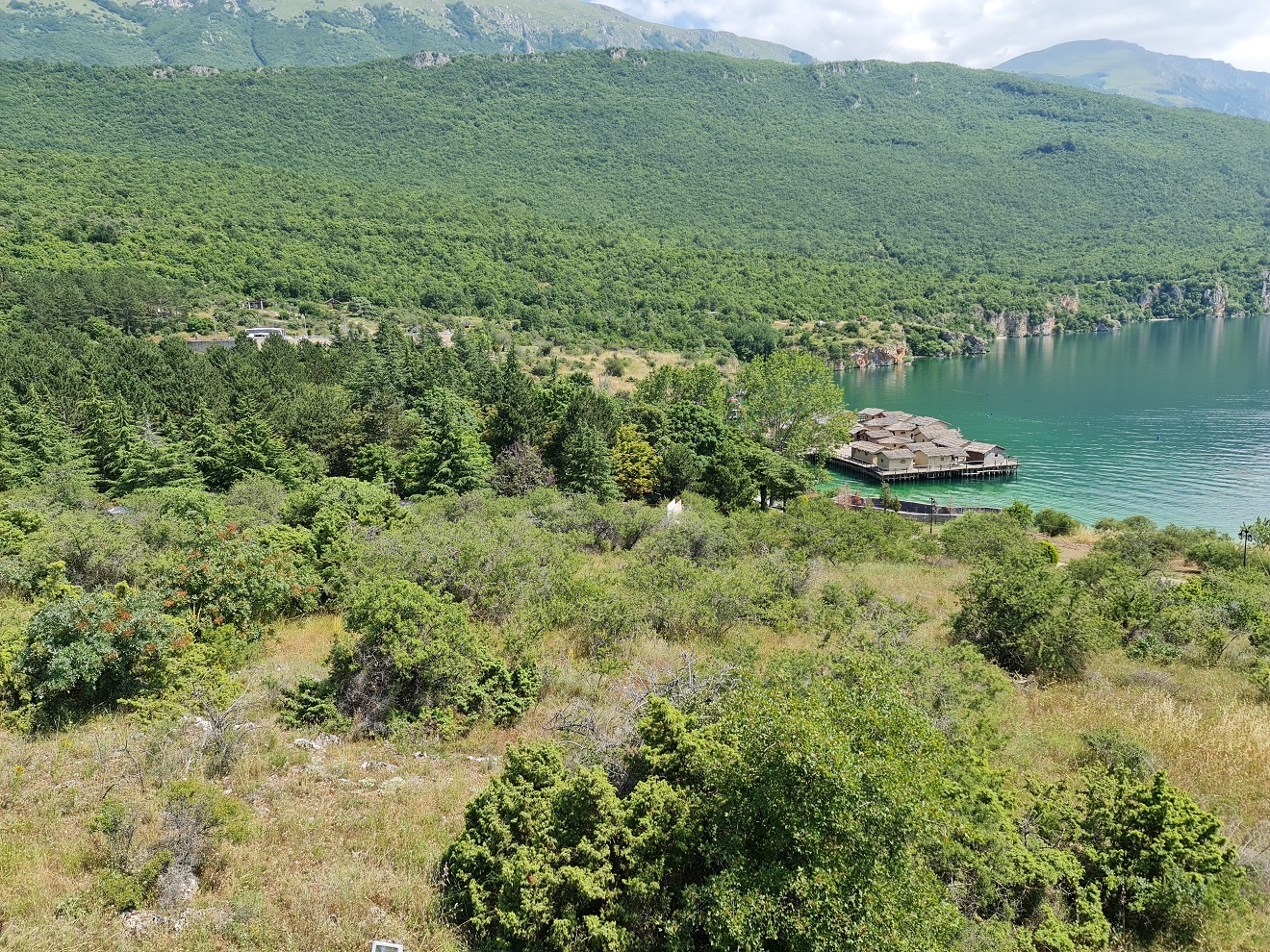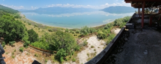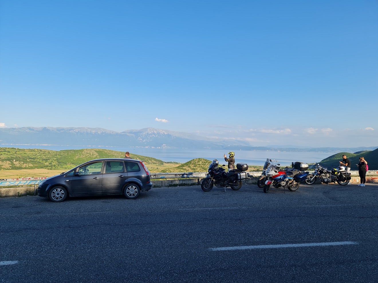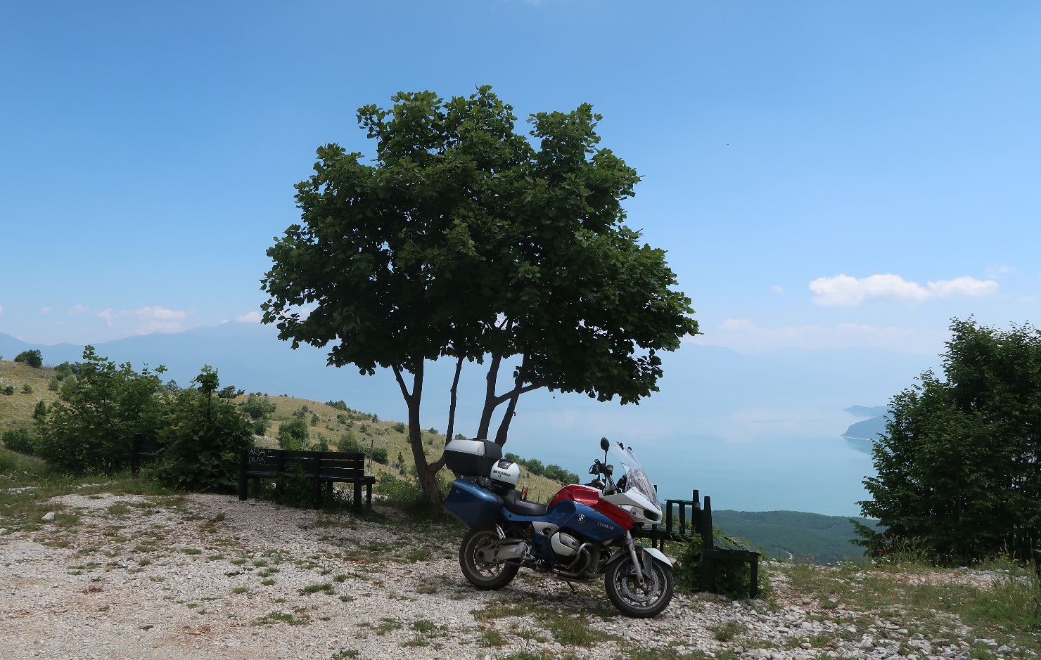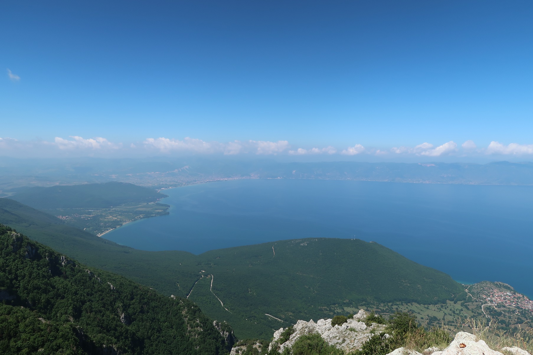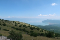 Úchvatnou dopolední vyhlídku Baba na jezero Ohrid se sluncem v zádech doplnila vyhlídka na jezero Prespa s nově upraveným výhledem od lavičky s vyřezanými keři.