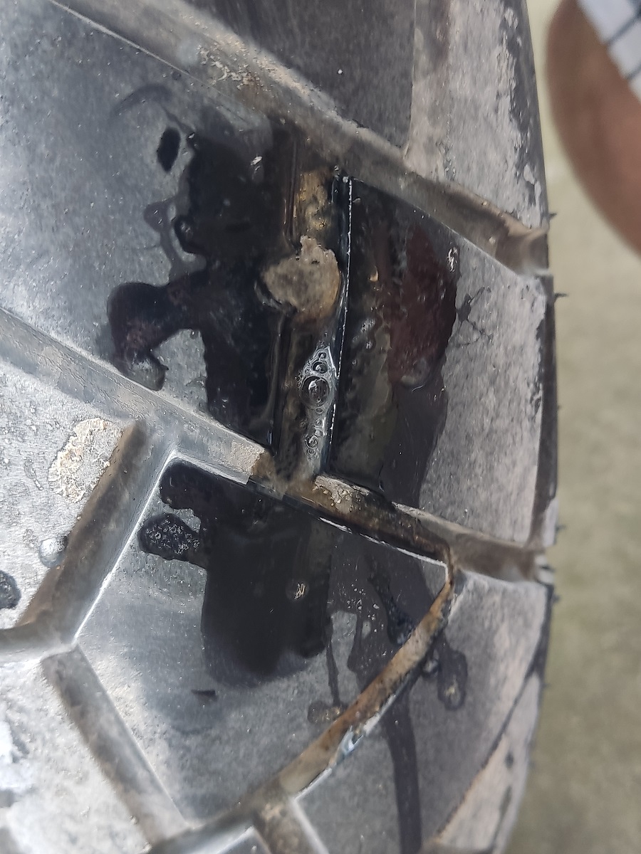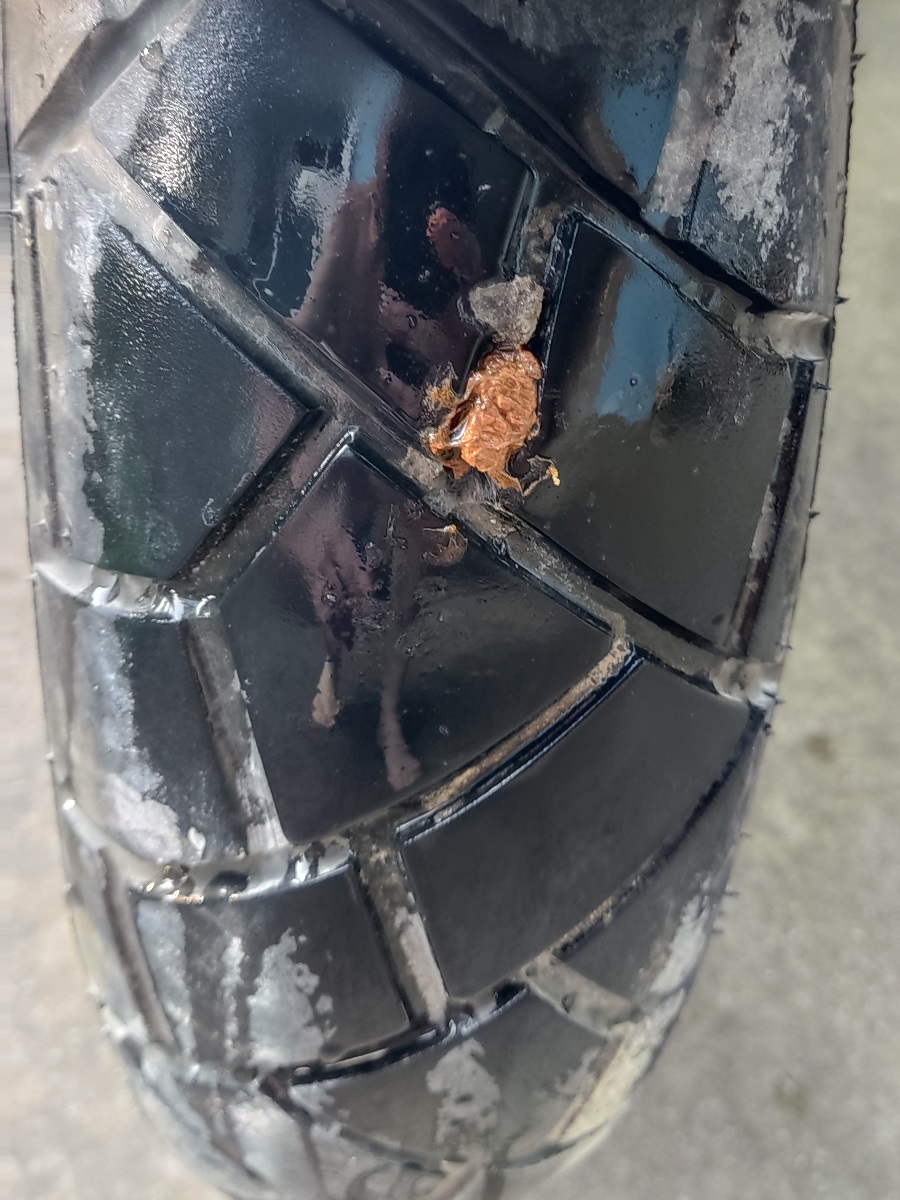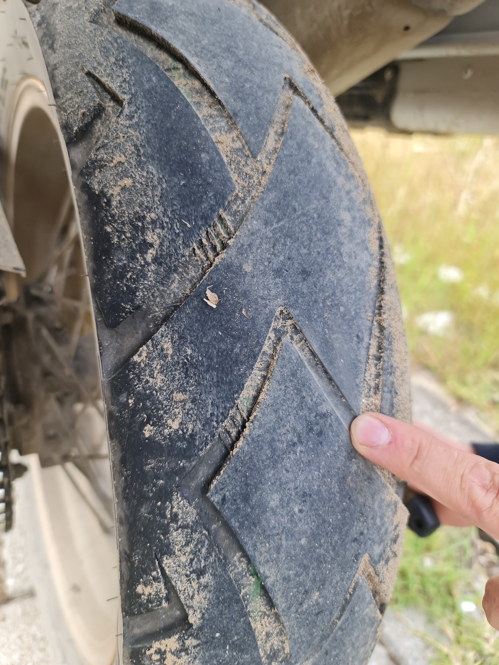 Na jedné ze zastávek Mára hodnotí stav zadní pneu, Dunlop Trailmax Mission dojela jen tak-tak. Moje je na tom o dost lépe, oba jsme obouvali před odjezdem.