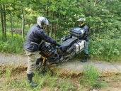 Ukazuju mu to v appce mapy.cz a spokojený pán odchází v průběhu instalace seznamáckých map do svého telefonu. My shledáme pěšinu sjízdnou a kolem rodinky s naším tipem na mapy se na motorkách drápeme lesem, kamenitou cestou, na rozcestí.