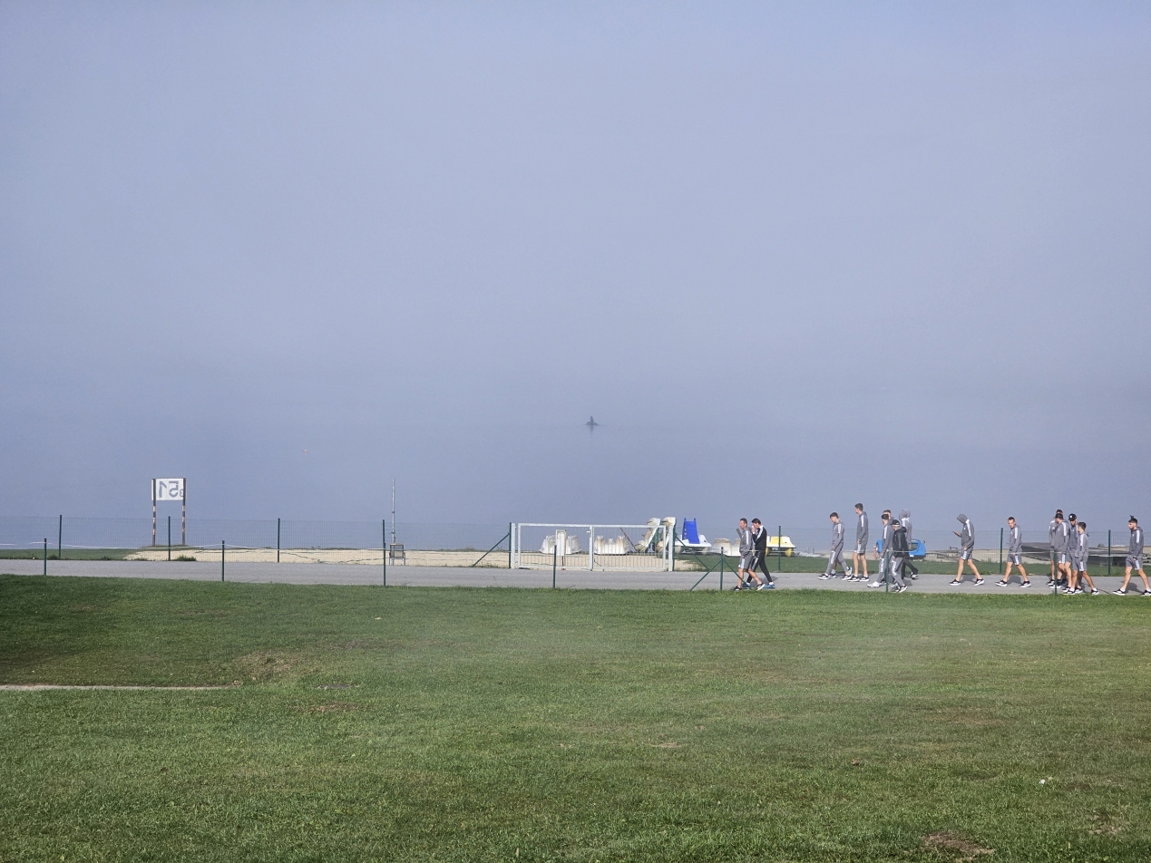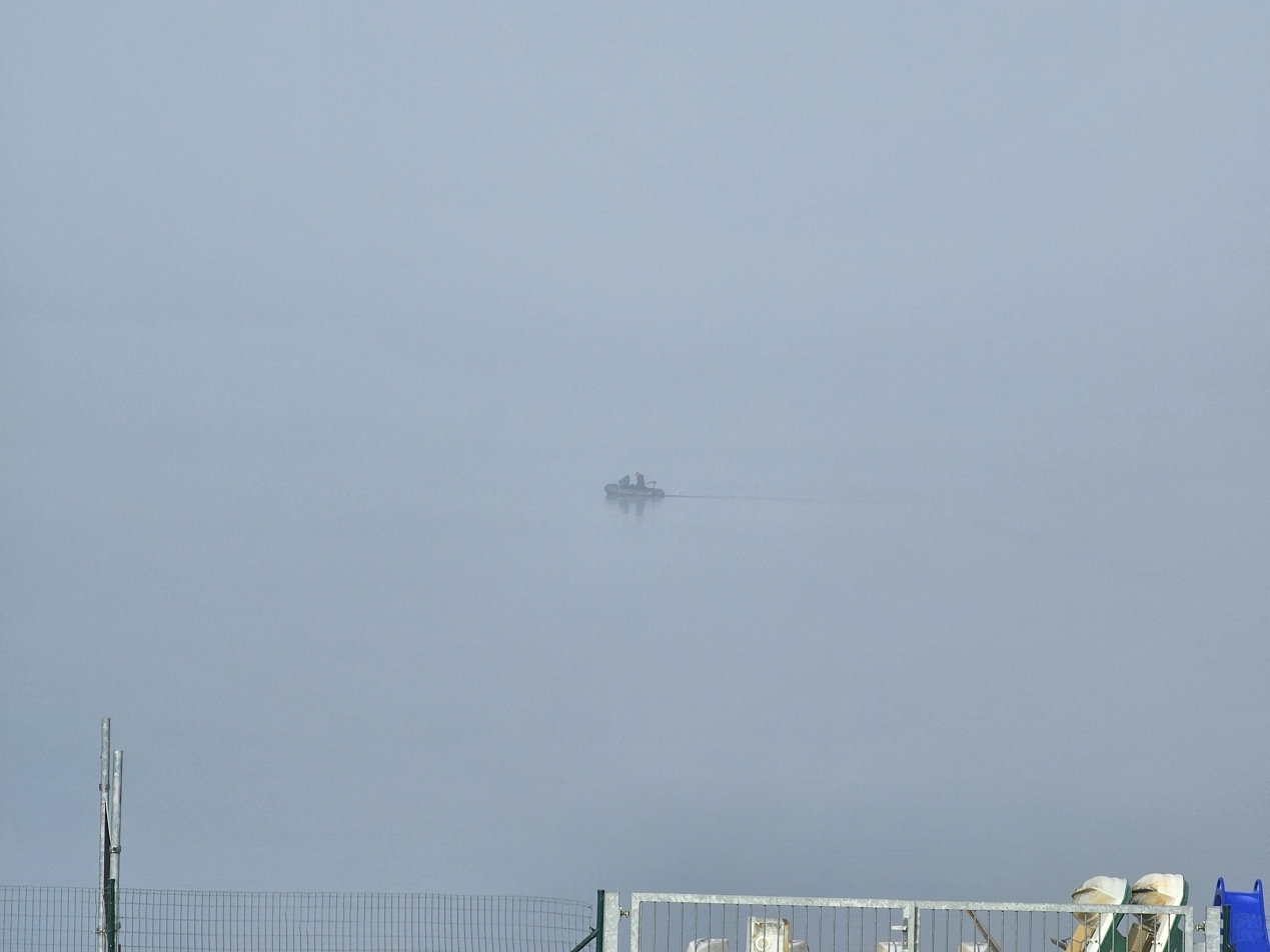 Ráno je mlhavější než včerejší, po snídani a zaplacení se zabalím a opět jedu za ostatními k hotelu Racek. Rybáři na loďce se ztrácejí v mlze, než ji slunko odpaří a odežene.