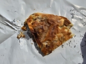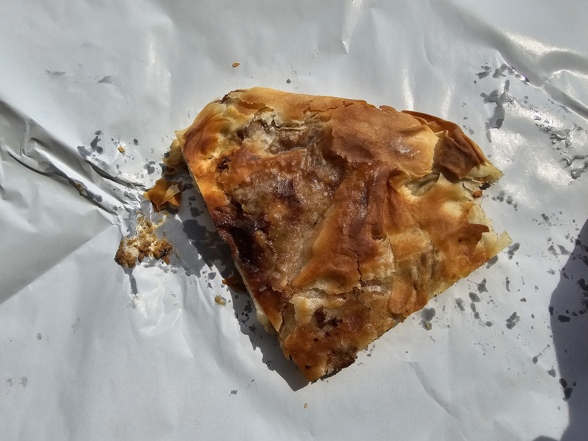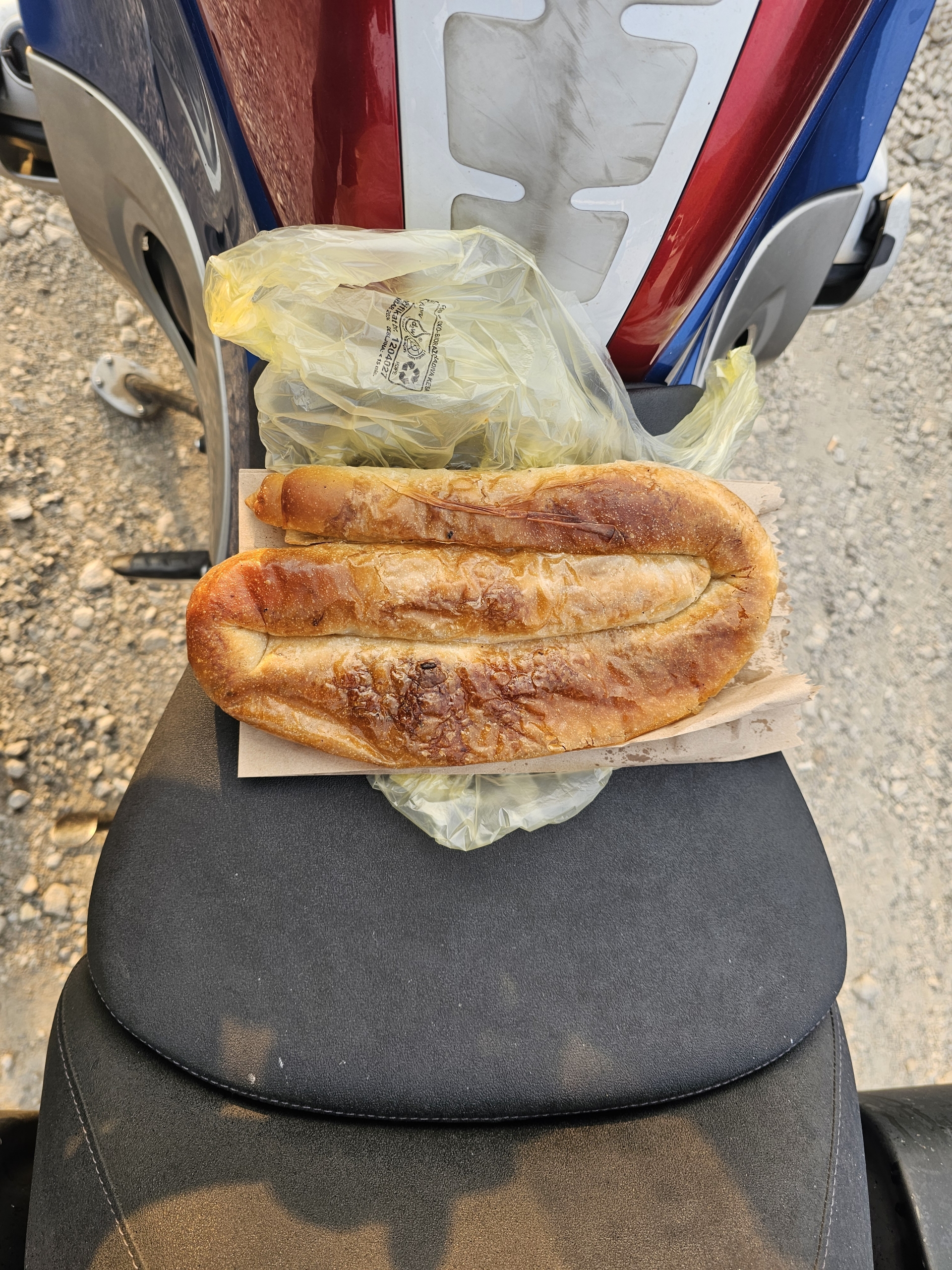 U pekařského stánku si zlepším náladu po pádu a zároveň plním první úkol dovolené, masový burek k snídani.
