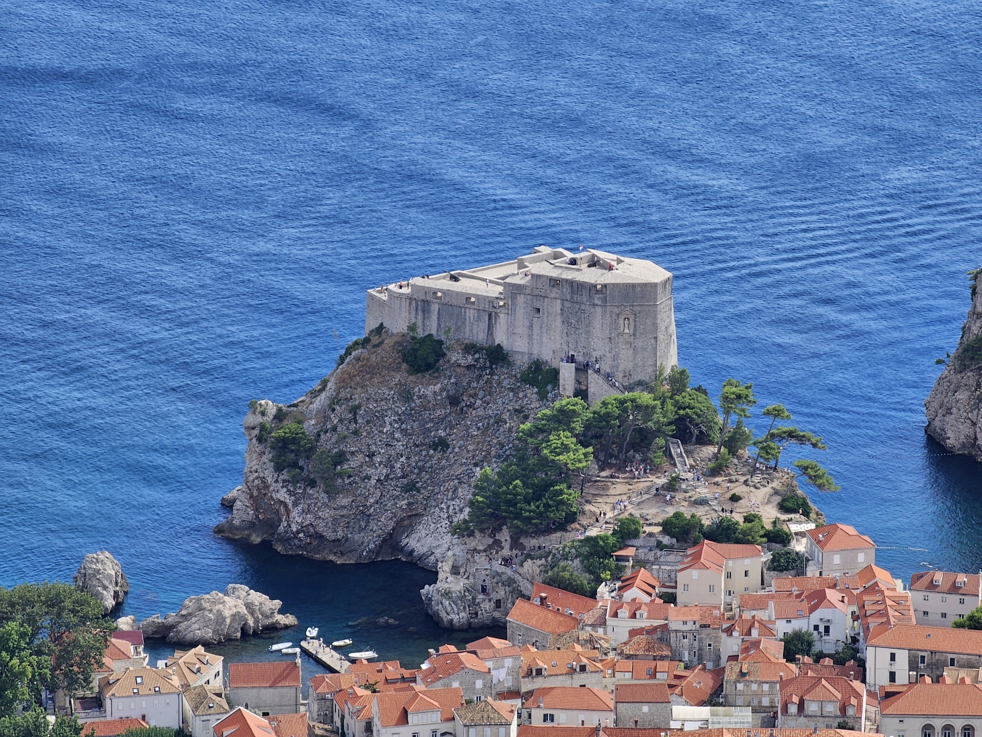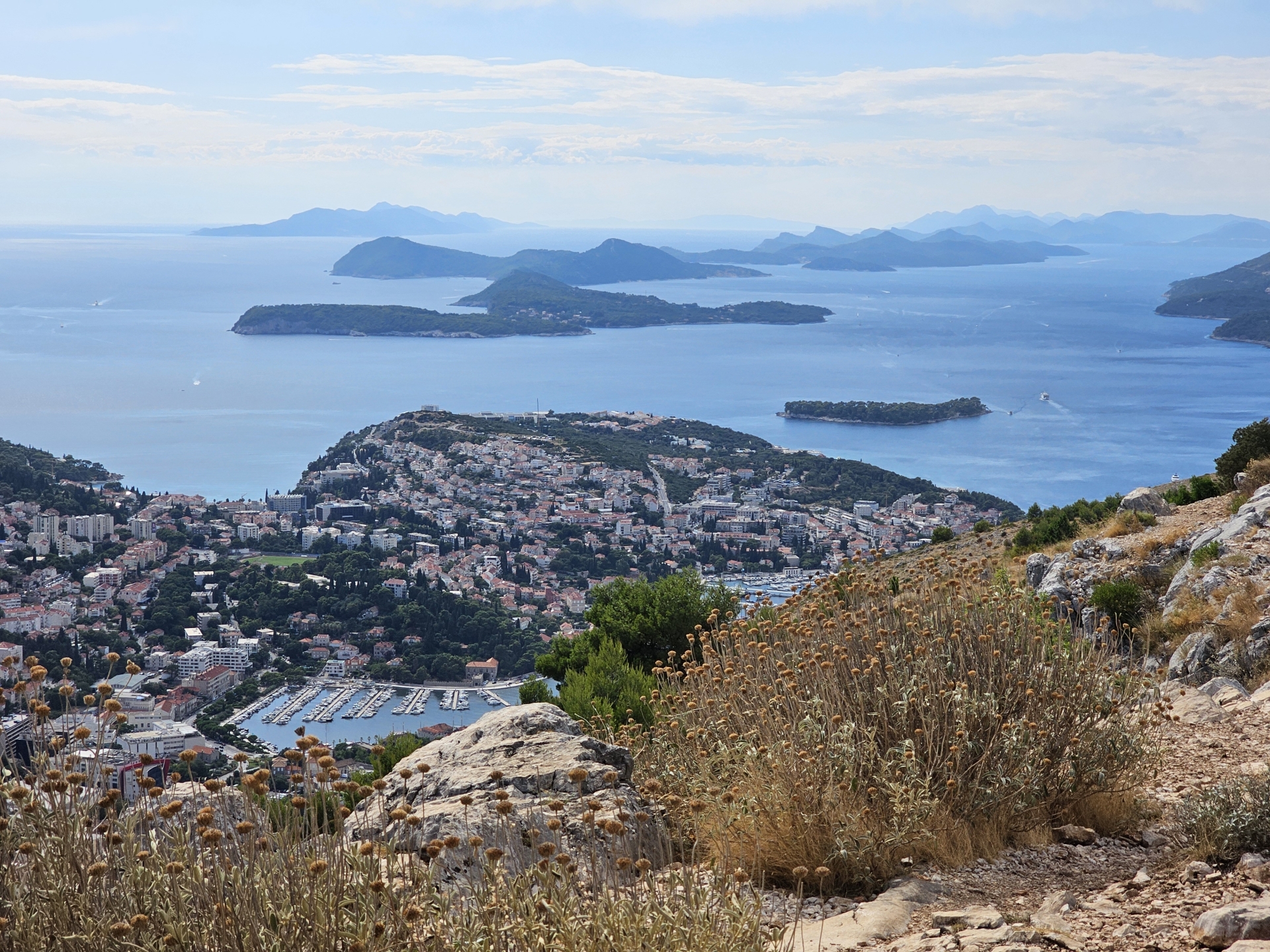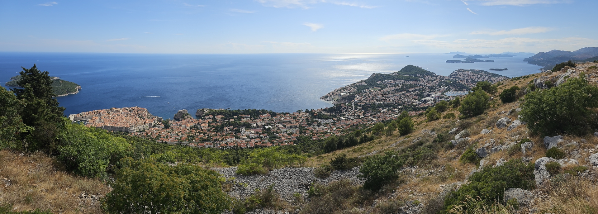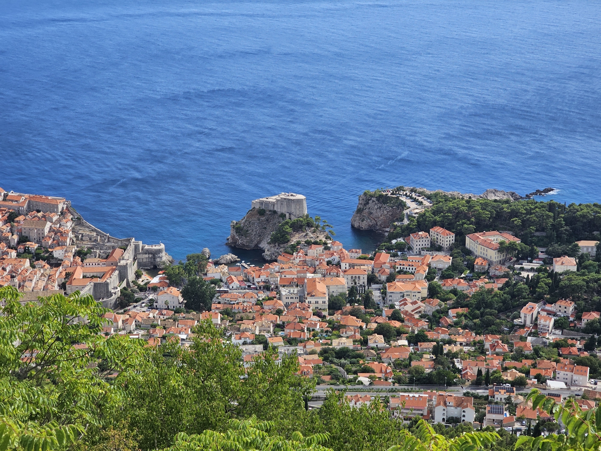 Vyhlídka Srđ na Dubrovník už je za letního slunečného počasí. Protrpím nějaké kolony, zkrátím si cestu trajektem přes Kotorskou zátoku před tmou stihnu fotku z výšky na zátoku.