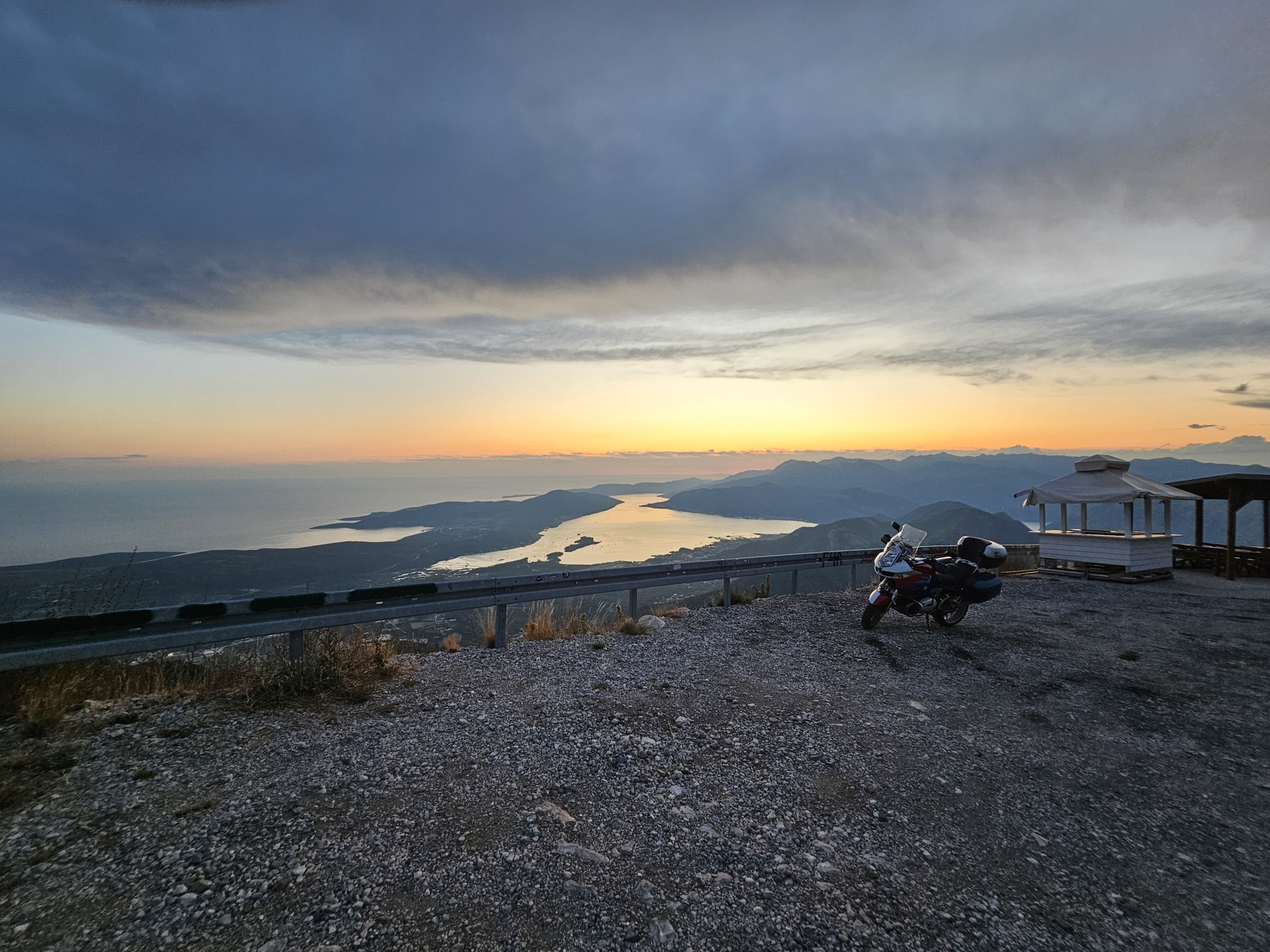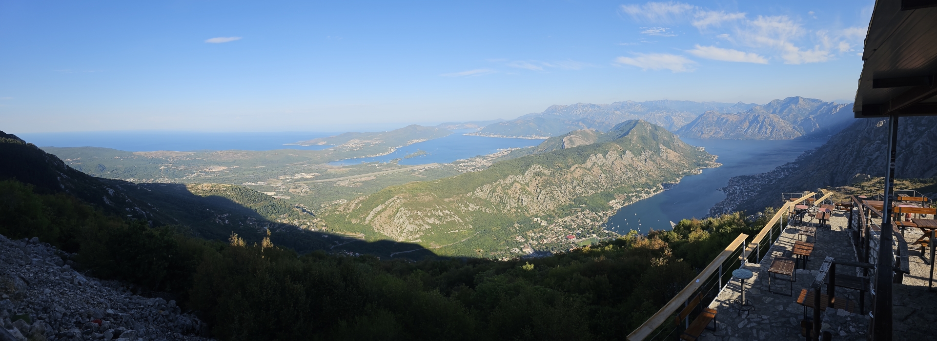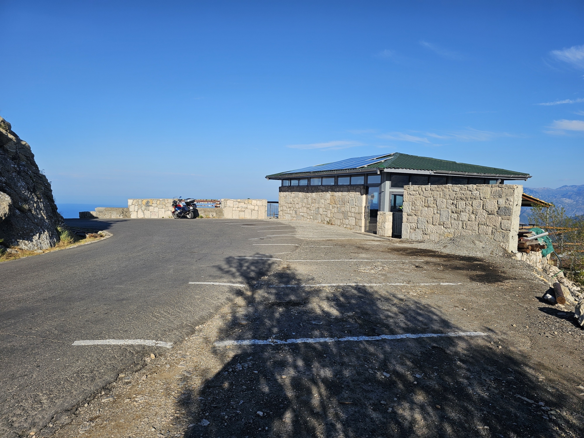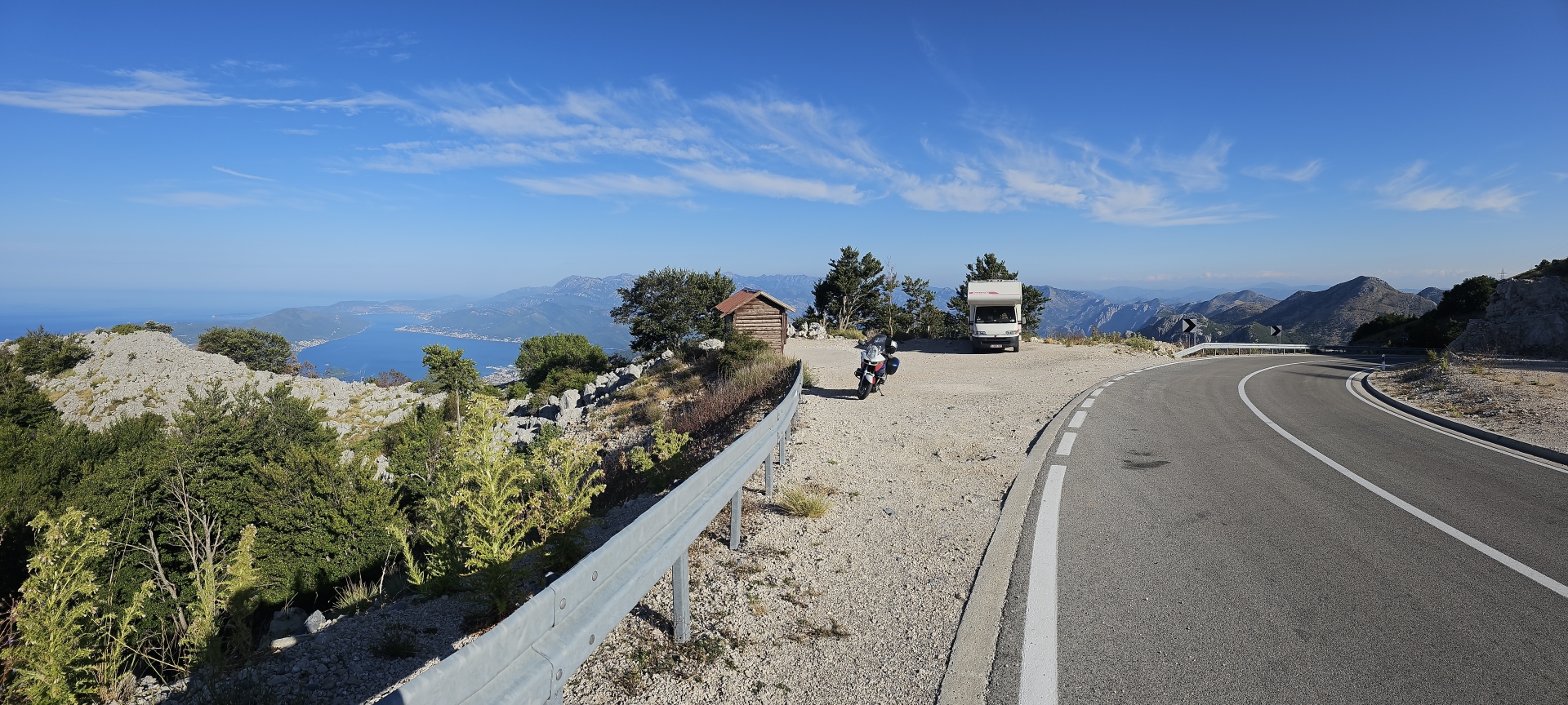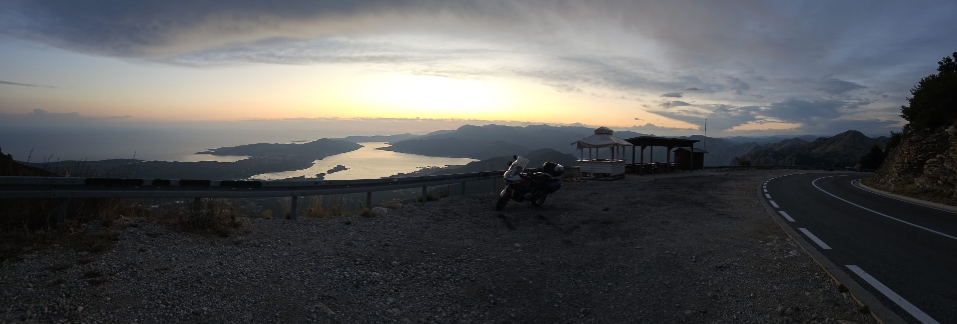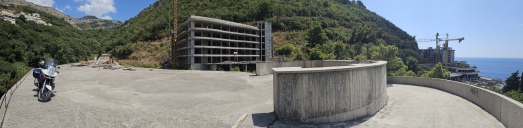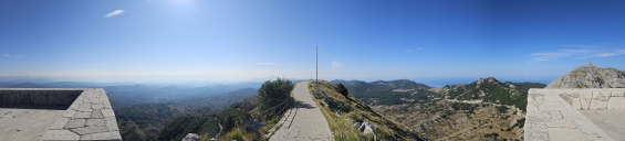 Ráno zpět na vyhlídku na zátoku Kotor, restaurace tu v roce 2018 nestála, jen základová plošina. Konečně mám letní počasí.