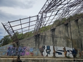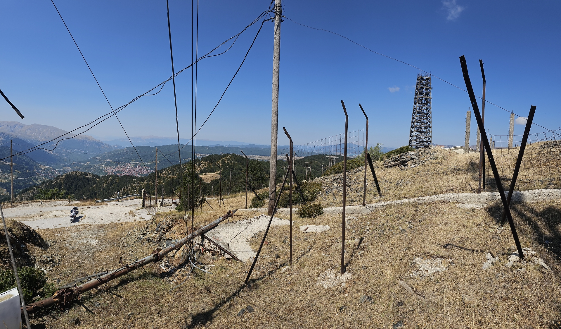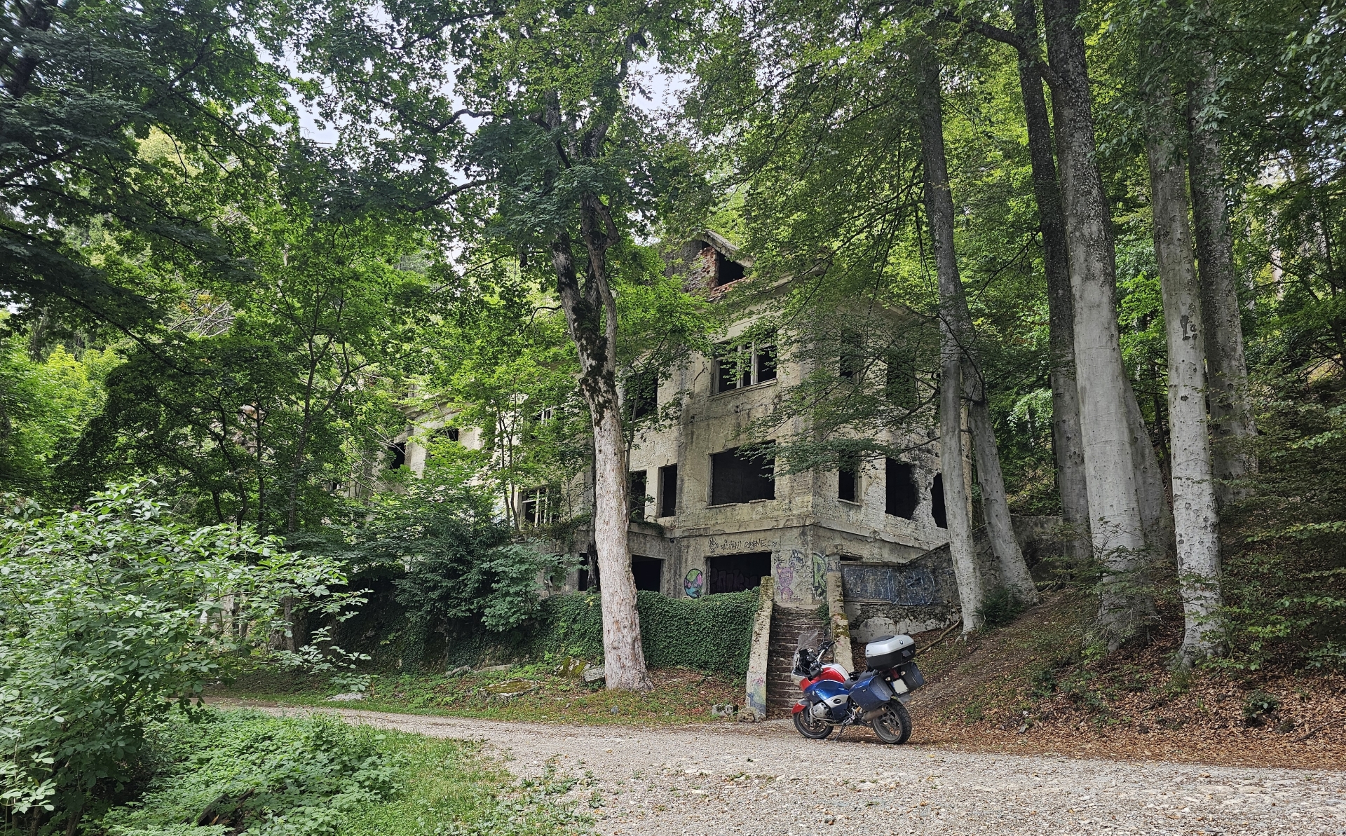 Udělám jen několik fotek zvenku a jedu dál, čekat hodinku-dvě v lijáku v ruině se mi nechce, parkoviště k televizní věži je na sestupné části horské cesty a jet zpět do města by mě dost zdrželo.
